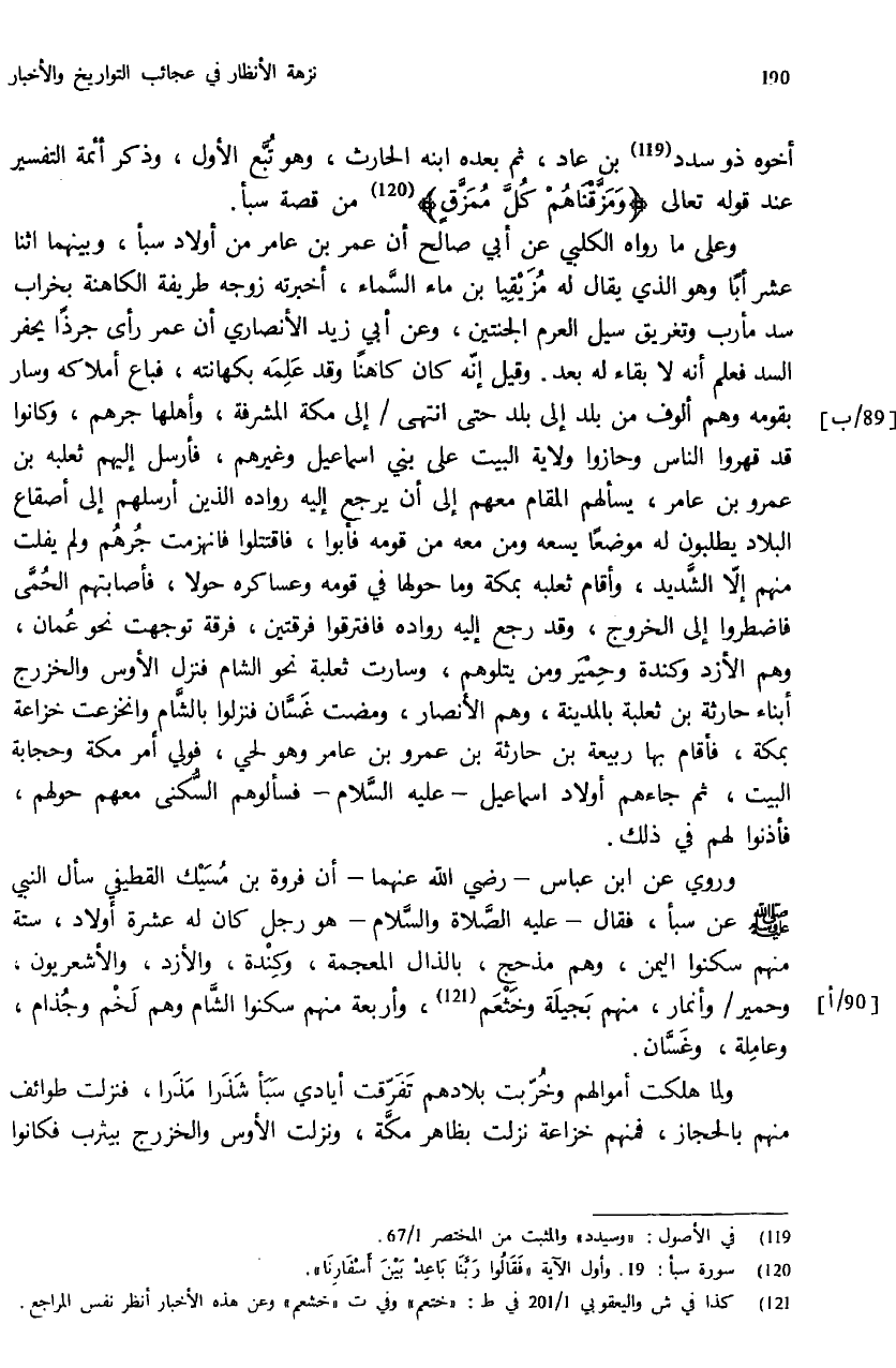 وروي عن ابن عباس - رضي الله عنهما - أن فروة بن مسيك القطيفي سأل النبي صلّى الله عليه وسلم عن سبأ، فقال - عليه الصّلاة والسّلام - هو رجل كان له عشرة أولاد، ستة منهم سكنوا اليمن، وهم مذحج، بالذال المعجمة، وكندة، والأزد، والأشعريون، وحمير / وأنمار، منهم بجيلة وخثعم (¬121)، وأربعة منهم سكنوا الشّام وهم لخم وجذام، وعاملة، وغسّان.