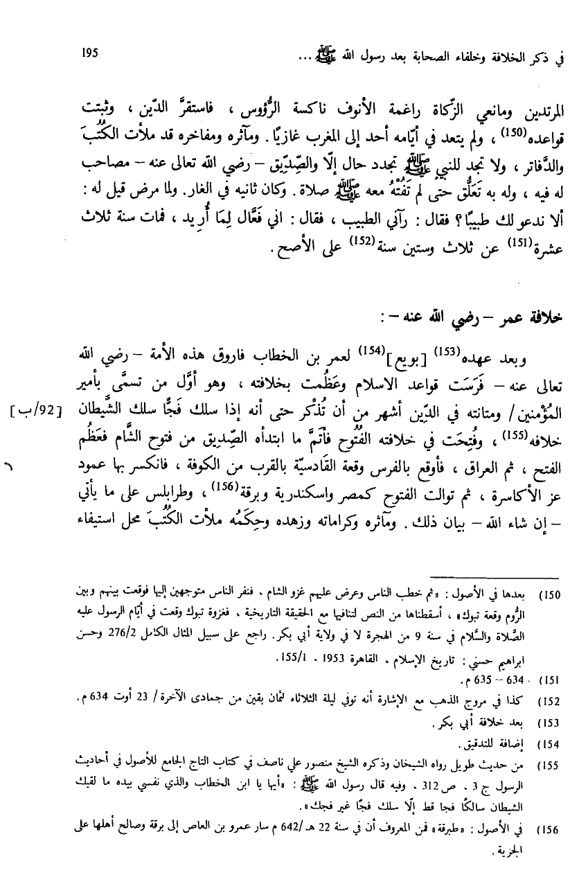 (¬150) بعدها في الأصول: «ثم خطب الناس وعرض عليهم غزو الشام، فنفر الناس متوجهين إليها فوقعت بينهم وبين الرّوم وقعة تبوك»، أسقطناها من النص لتنافيها مع الحقيقة التاريخية، فغزوة تبوك وقعت في أيّام الرسول عليه الصّلاة والسّلام في سنة 9 من الهجرة لا في ولاية أبي بكر. راجع على سبيل المثال الكامل 2/ 276 وحسن ابراهيم حسني: تاريخ الإسلام، القاهرة 1953، 1/ 155.