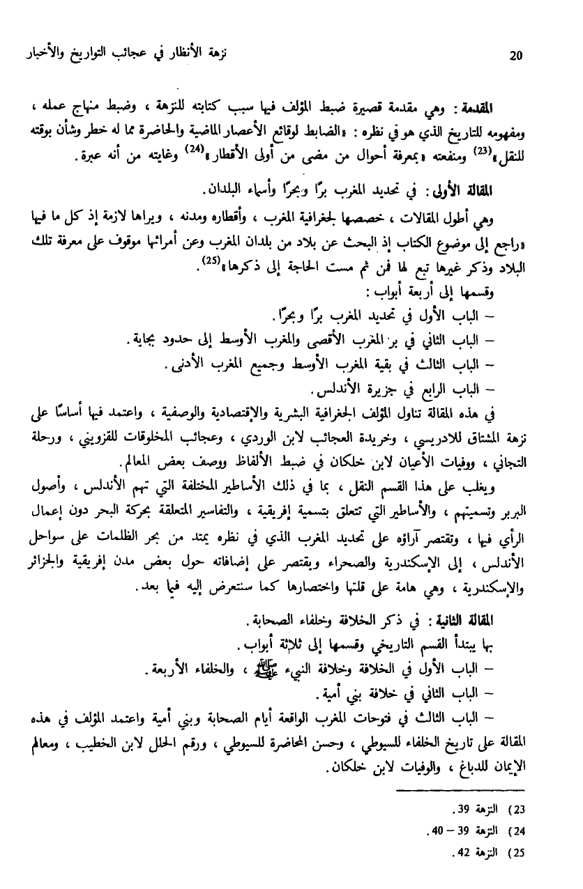 المقدمة: وهي مقدمة قصيرة ضبط المؤلف فيها سبب كتابته للنزهة، وضبط منهاج عمله، ومفهومه للتاريخ الذي هو في نظره: «الضابط لوقائع الأعصار الماضية والحاضرة مما له خطر وشأن بوقته للنقل» (¬23) ومنفعته «بمعرفة أحوال من مضى من أولى الأقطار» (¬24) وغايته من أنه عبرة.