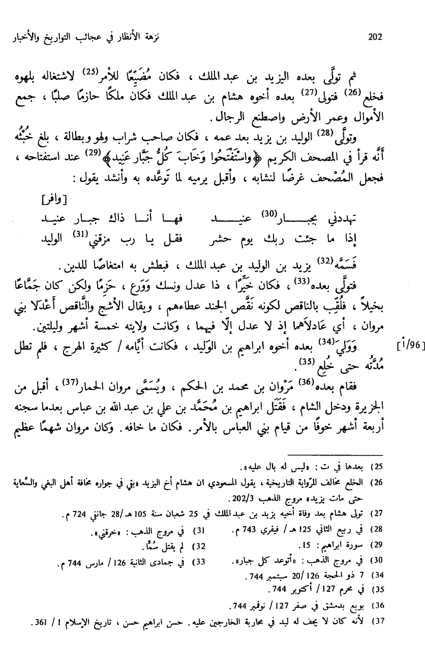 (¬26) الخلع مخالف للرّواية التاريخية، يقول المسعودي ان هشام أخ اليزيد «بقي في جواره مخافة أهل البغي والسّعاية حتى مات يزيد» مروج الذهب 3/ 202.