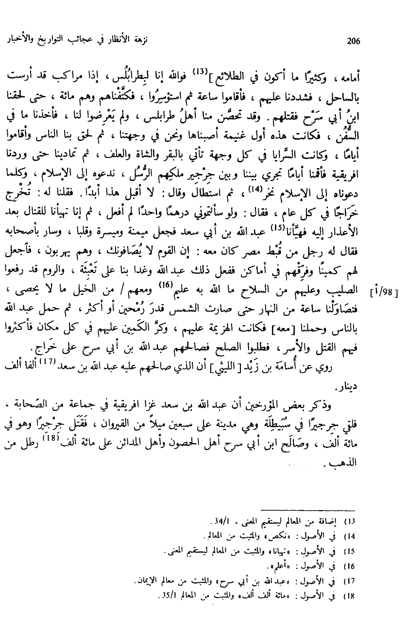 أمامه، وكثيرا ما أكون في الطلائع] (¬13) فو الله إنا لبطرابلس، إذا مراكب قد أرست بالساحل، فشددنا عليهم، فأقاموا ساعة ثم استؤسروا، فكتّفناهم وهم مائة، حتى لحقنا ابن أبي سرح فقتلهم. وقد تحصّن منا أهل طرابلس، ولم يعرضوا لنا، فأخذنا ما في السّفن، فكانت هذه أول غنيمة أصبناها ونحن في وجهتنا، ثم لحق بنا الناس وأقاموا أياما، وكانت السّرايا في كل وجهة تأتي بالبقر والشاة والعلف، ثم تمادينا حتى وردنا افريقية فأقمنا أياما تجري بيننا وبين جرجير ملكهم الرّسل، ندعوه إلى الإسلام، وكلما دعوناه إلى الإسلام نخر (¬14)، ثم استطال وقال: لا أقبل هذا أبدا. فقلنا له: تخرج خراجا في كل عام، فقال: ولو سألتموني درهما واحدا لم أفعل، ثم إنا تهيأنا للقتال بعد الأعذار إليه فهيّأنا (¬15) عبد الله بن أبي سعد فجعل ميمنة وميسرة وقلبا، وسار بأصحابه فقال له رجل من قبط مصر كان معه: إن القوم لا يصافونك، وهم يهربون، فاجعل لهم كمينا وفرّقهم في أماكن ففعل ذلك عبد الله وغدا بنا على تعبئة، والروم قد رفعوا الصليب وعليهم من السلاح ما الله به عليم (¬16) ومعهم / من الخيل ما لا يحصى، فتصاولنا ساعة من النهار حتى صارت الشمس قدر رمحين أو أكثر، ثم حمل عبد الله بالناس وحملنا [معه] فكانت الهزيمة عليهم، وكرّ الكمين عليهم في كل مكان فأكثروا فيهم القتل والأسر، فطلبوا الصلح. فصالحهم عبد الله بن أبي سرح على خراج.
