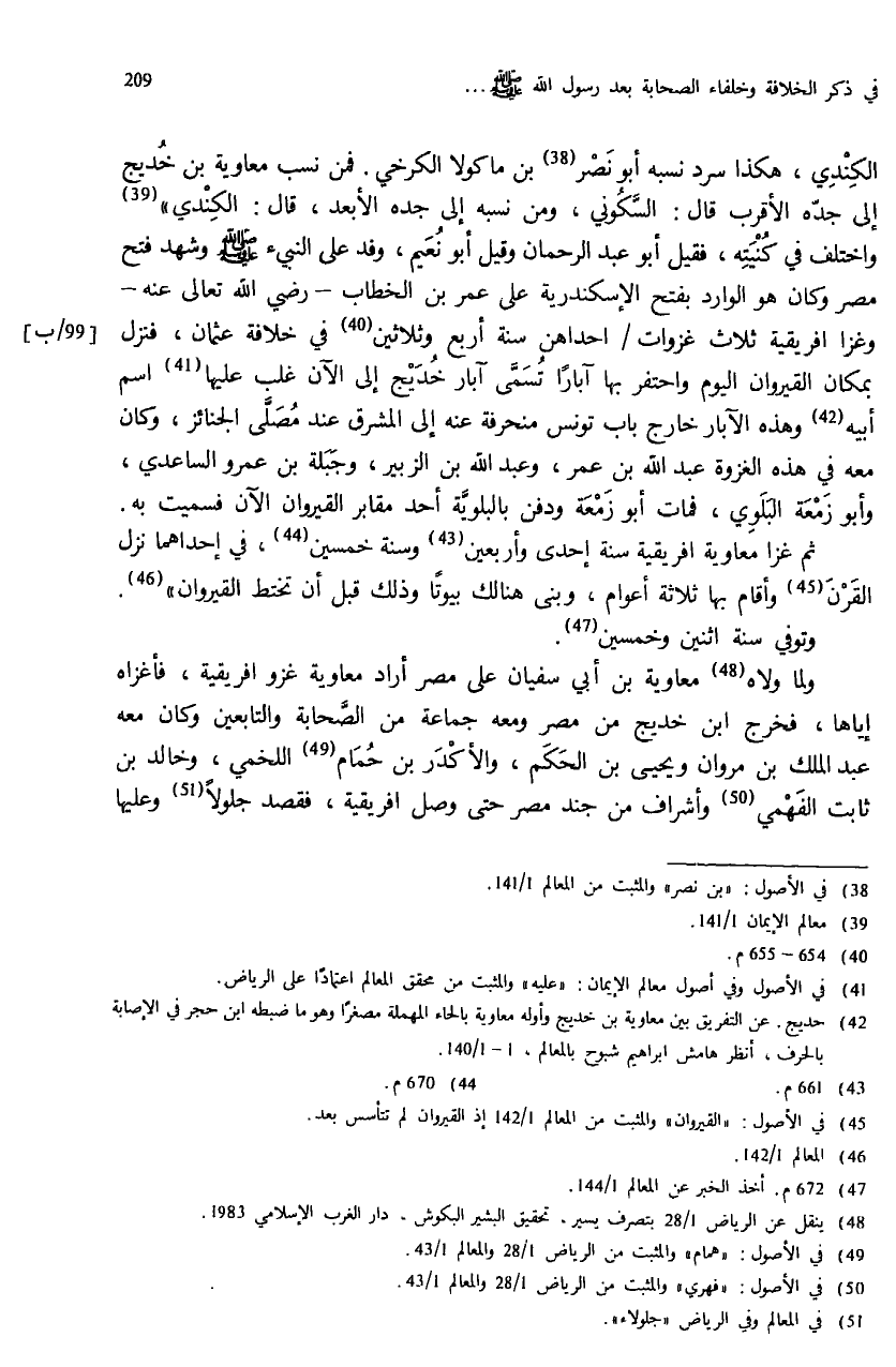 (¬42) حديج. عن التفريق بين معاوية بن خديج وأوله معاوية بالحاء المهملة مصغرا وهو ما ضبطه ابن حجر في الإصابة بالحرف، أنظر هامش ابراهيم شبوح بالمعالم، 1 - 1/ 140.