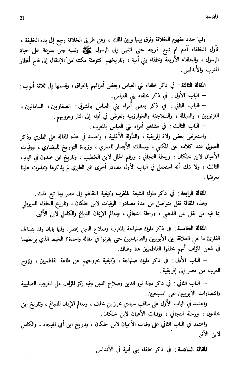 وفيها حدد مفهوم الخلافة وفرق بينها وبين الملك، وعن طريق الخلافة رجع إلى بدء الخليقة، فأول الخلفاء آدم هم تتبع ذريته حتى انتهى إلى الرسول صلّى الله عليه وسلم ونسبه ومر بسرعة على حياة الرسول، والخلفاء الأربعة وخلفاء بني أمية، وتاريخهم كتوطئة مكنته من الإنتقال إلى فتح أقطار المغرب والأندلس.