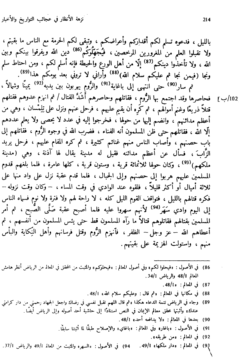 (¬89) وجاء في الرياض تتمة الدعاء هكذا «ثم قال اللهم تقبل نفسي في رضاك واجعل الجهاد رحمتي من دار كرامتي عندك» وأثبتها محقق معالم الإيمان في النص استنادا إلى حاشية أحد أصوله وإلى الرياض أيضا.
