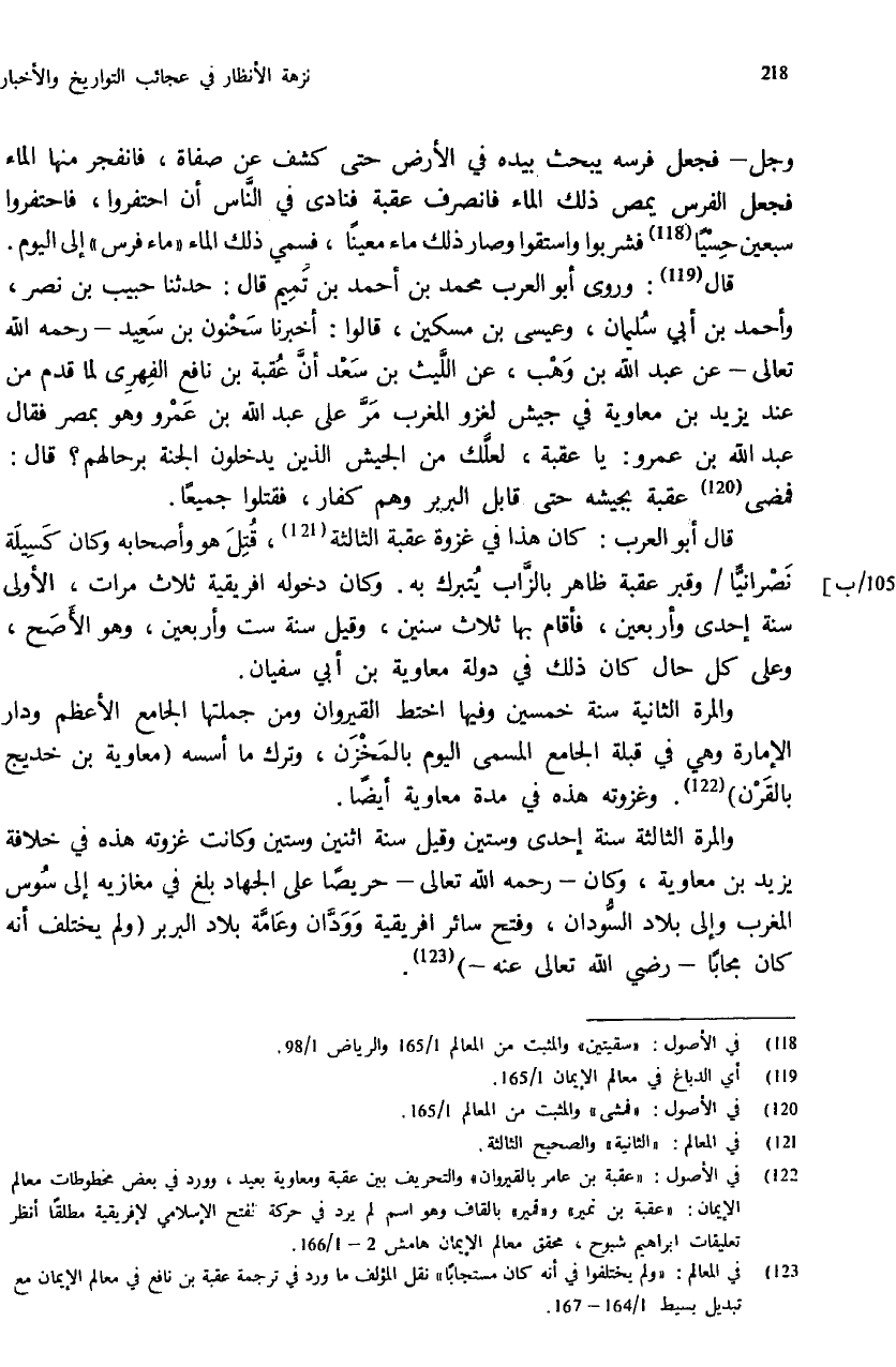(¬122) في الأصول: «عقبة بن عامر بالقيروان» والتحريف بين عقبة ومعاوية بعيد، وورد في بعض مخطوطات معالم الإيمان: «عقبة بن نمير» و «قمير» بالقاف وهو اسم لم يرد في حركة الفتح الإسلامي لإفريقية مطلقا أنظر تعليقات ابراهيم شبوح، محقق معالم الإيمان هامش 2 - 1/ 166.