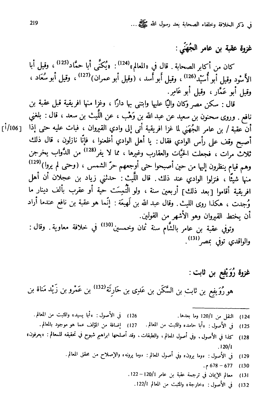 (¬131) معالم الإيمان في ترجمة عقبة بن عامر 1/ 120 - 122.