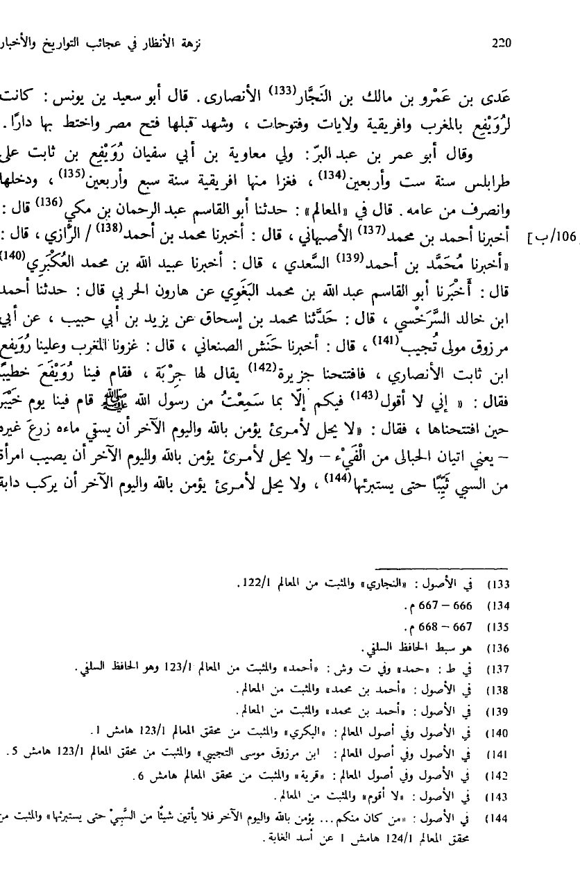 «أخبرنا محمّد بن أحمد (¬139) السّعدي، قال: أخبرنا عبيد الله بن محمد العكبري (¬140) قال: أخبرنا أبو القاسم عبد الله بن محمد البغوي عن هارون الحربي قال: حدثنا أحمد ابن خالد السّرخسي، قال: حدّثنا محمد بن إسحاق عن يزيد بن أبي حبيب، عن أبي مرزوق مولى تجيب (¬141)، قال: أخبرنا حنش الصنعاني، قال: غزونا المغرب وعلينا رويفع ابن ثابت الأنصاري، فافتتحنا جزيرة (¬142) يقال لها جربة، فقام فينا رويفع خطيبا فقال: «إني لا أقول (¬143) فيكم إلاّ بما سمعت من رسول الله صلّى الله عليه وسلم قام فينا يوم خيبر حين افتتحناها، فقال: «لا يحل لأمرئ يؤمن بالله واليوم الآخر أن يسقي ماءه زرع غيره - يعني اتيان الحبالي من الفيء - ولا يحل لأمرئ يؤمن بالله واليوم الآخر أن يصيب امرأة من السبي ثيّبا حتى يستبرئها (¬144)، ولا يحل لأمرئ يؤمن بالله واليوم الآخر أن يركب دابة