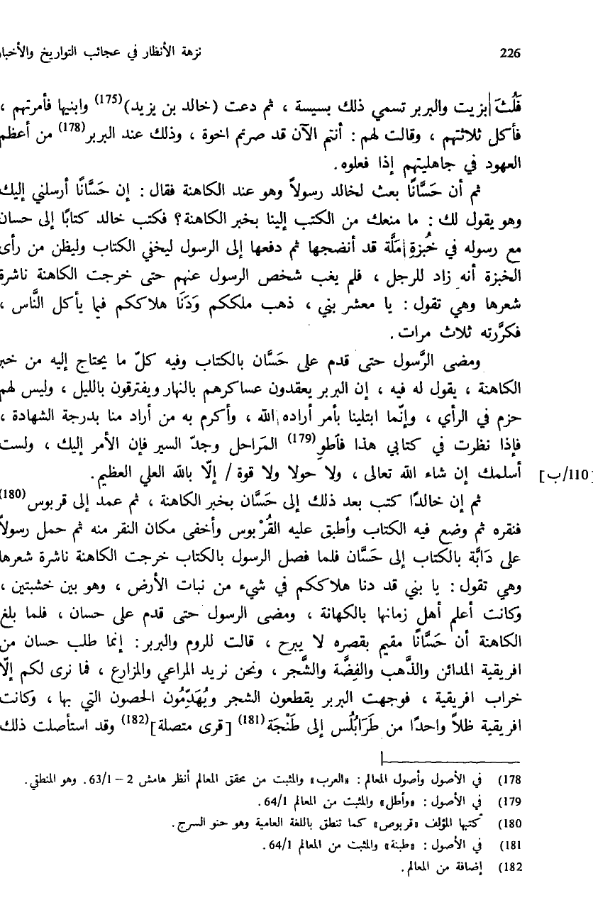 ومضى الرّسول حتى قدم على حسّان بالكتاب وفيه كلّ ما يحتاج إليه من خبر الكاهنة، يقول له فيه، إن البربر يعقدون عساكرهم بالنهار ويفترقون بالليل، وليس لهم حزم في الرأي، وإنّما ابتلينا بأمر أراده الله، وأكرم به من أراد منا بدرجة الشهادة، فإذا نظرت في كتابي هذا فاطو (¬179) المراحل وجدّ السير فإن الأمر إليك، ولست أسلمك إن شاء الله تعالى، ولا حولا ولا قوة / إلاّ بالله العلي العظيم.