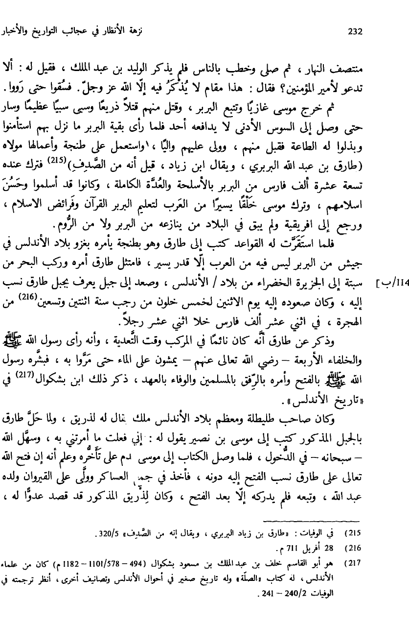 (¬215) في الوفيات: «طارق بن زياد البربري، ويقال إنه من الصّدف» 5/ 320.