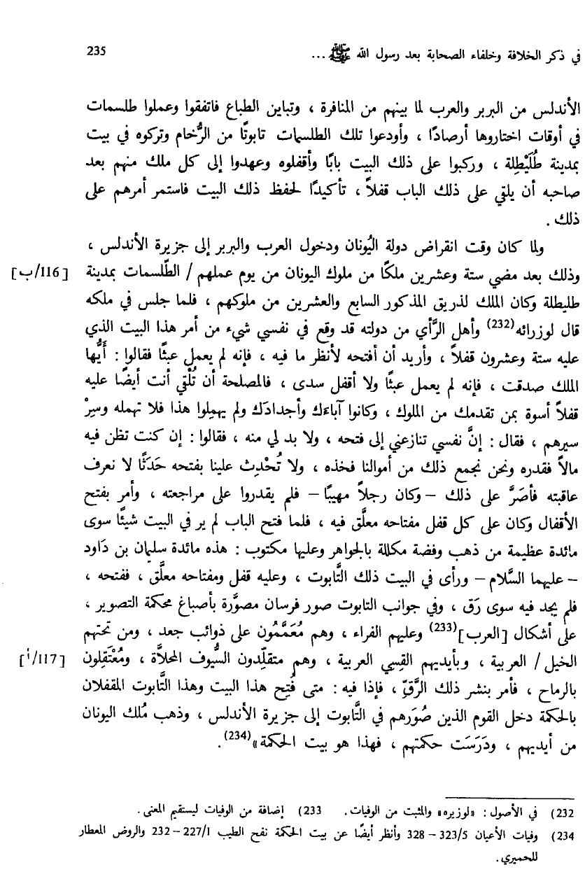 ولما كان وقت انقراض دولة اليونان ودخول العرب والبربر إلى جزيرة الأندلس، وذلك بعد مضي ستة وعشرين ملكا من ملوك اليونان من يوم عملهم / الطّلسمات بمدينة طليطلة وكان الملك لذريق المذكور السابع والعشرين من ملوكهم، فلما جلس في ملكه قال لوزرائه (¬232) وأهل الرّأي من دولته قد وقع في نفسي شيء من أمر هذا البيت الذي عليه ستة وعشرون قفلا، وأريد أن أفتحه لأنظر ما فيه، فإنه لم يعمل عبثا فقالوا: أيّها الملك صدقت، فإنه لم يعمل عبثا ولا أقفل سدى، فالمصلحة أن تلقي أنت أيضا عليه قفلا أسوة بمن تقدمك من الملوك، وكانوا آباءك وأجدادك ولم يهملوا هذا فلا تهمله وسر سيرهم، فقال: إنّ نفسي تنازعني إلى فتحه، ولا بد لي منه، فقالوا: إن كنت تظن فيه مالا فقدره ونحن نجمع ذلك من أموالنا فخذه، ولا تحدث علينا بفتحه حدثا لا نعرف عاقبته فأصرّ على ذلك - وكان رجلا مهيبا - فلم يقدروا على مراجعته، وأمر بفتح الأقفال وكان على كل قفل مفتاحه معلّق فيه، فلما فتح الباب لم ير في البيت شيئا سوى مائدة عظيمة من ذهب وفضة مكللة بالجواهر وعليها مكتوب: هذه مائدة سليمان بن داود - عليهما السّلام - ورأى في البيت ذلك التّابوت، وعليه قفل ومفتاحه معلّق، ففتحه، فلم يجد فيه سوى رق، وفي جوانب التابوت صور فرسان مصوّرة بأصباغ محكمة التصوير، على أشكال [العرب] (¬233) وعليهم الفراء، وهم معمّمون على ذوائب جعد، ومن تحتهم الخيل / العربية، وبأيديهم القسي العربية، وهم متقلّدون السّيوف المحلاّة، ومعتقلون بالرماح، فأمر بنشر ذلك الرّقّ، فإذا فيه: متى فتح هذا البيت وهذا التّابوت المقفلان بالحكمة دخل القوم الذين صورهم في التّابوت إلى جزيرة الأندلس، وذهب ملك اليونان من أيديهم، ودرست حكمتهم، فهذا هو بيت الحكمة» (¬234).