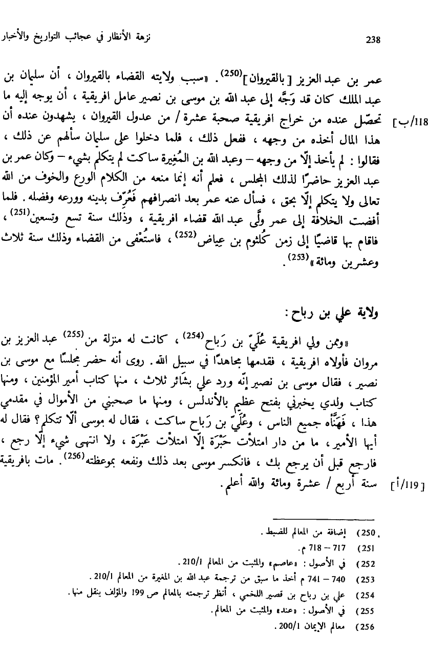 عمر بن عبد العزيز [بالقيروان] (¬250). «سبب ولايته القضاء بالقيروان، أن سليمان بن عبد الملك كان قد وجّه إلى عبد الله بن موسى بن نصير عامل افريقية، أن يوجه إليه ما تحصّل عنده من خراج افريقية صحبة عشرة / من عدول القيروان، يشهدون عنده أن هذا المال أخذه من وجهه، ففعل ذلك، فلما دخلوا على سليمان سألهم عن ذلك، فقالوا: لم يأخذ إلاّ من وجهه - وعبد الله بن المغيرة ساكت لم يتكلّم بشيء - وكان عمر بن عبد العزيز حاضرا لذلك المجلس، فعلم أنه إنما منعه من الكلام الورع والخوف من الله تعالى ولا يتكلم إلاّ بحق، فسأل عنه عمر بعد انصرافهم فعرّف بدينه وورعه وفضله. فلما أفضت الخلافة إلى عمر ولّى عبد الله قضاء افريقية، وذلك سنة تسع وتسعين (¬251)، فاقام بها قاضيا إلى زمن كلثوم بن عياض (¬252)، فاستعفى من القضاء وذلك سنة ثلاث وعشرين ومائة» (¬253).