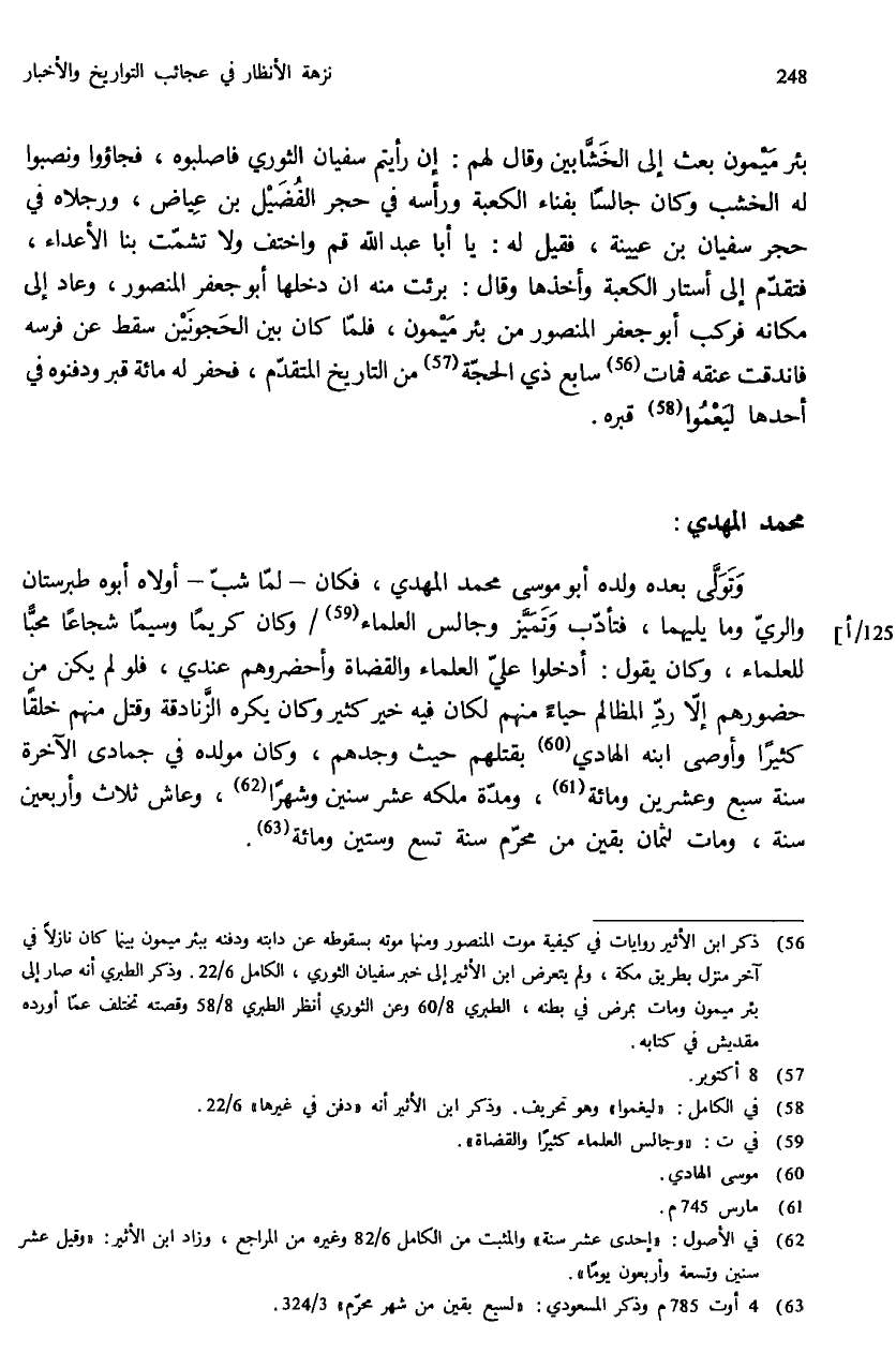 (¬56) ذكر ابن الأثير روايات في كيفية موت المنصور ومنها موته بسقوطه عن دابته ودفنه ببئر ميمون بينما كان نازلا في آخر منزل بطريق مكة، ولم يتعرض ابن الأثير إلى خبر سفيان الثوري، الكامل 6/ 22. وذكر الطبري أنه صار إلى بئر ميمون ومات بمرض في بطنه، الطبري 8/ 60 وعن الثوري أنظر الطبري 8/ 58 وقصته تختلف عمّا أورده مقديش في كتابه.