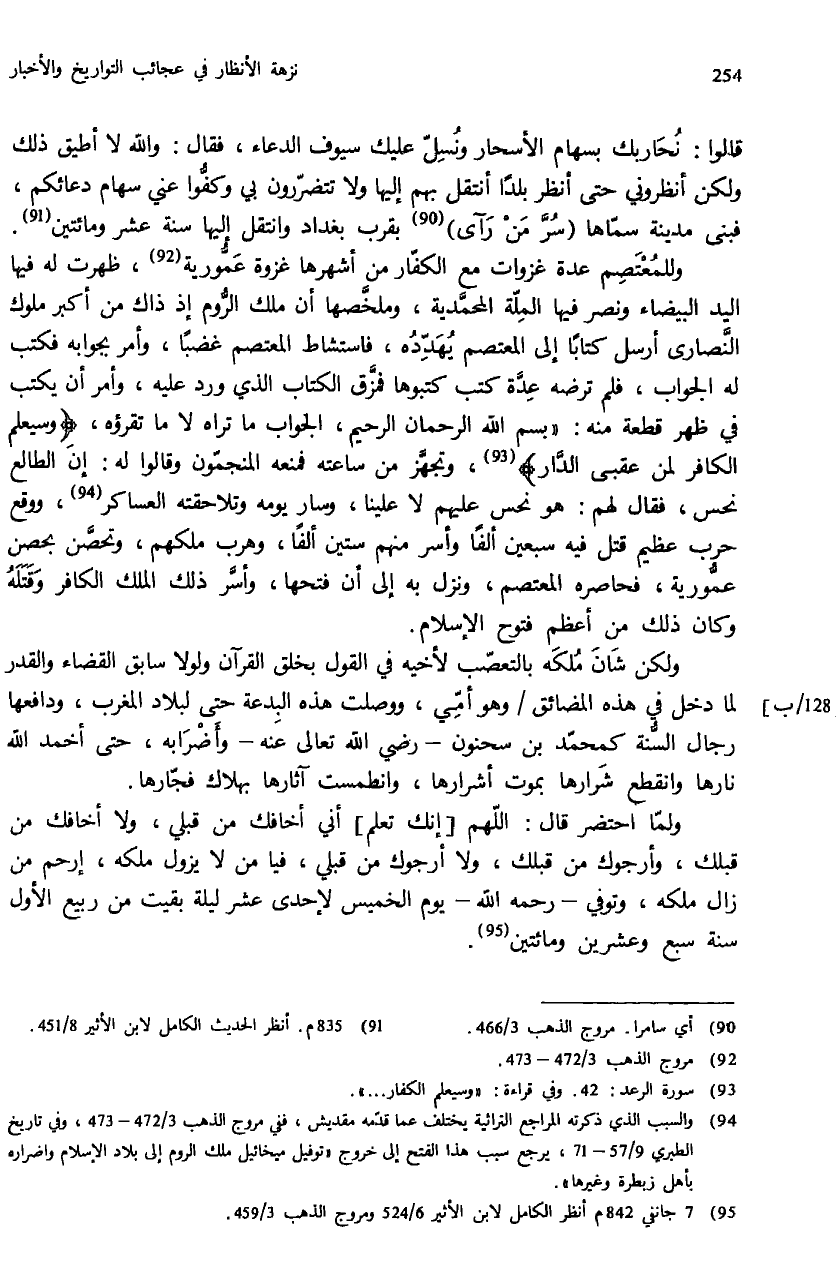 (¬94) والسبب الذي ذكرته المراجع التراثية يختلف عما قدّمه مقديش، ففي مروج الذهب 3/ 472 - 473، وفي تاريخ الطبري 9/ 57 - 71، يرجع سبب هذا الفتح إلى خروج «توفيل ميخائيل ملك الروم إلى بلاد الإسلام واضراره بأهل زبطرة وغيرها».