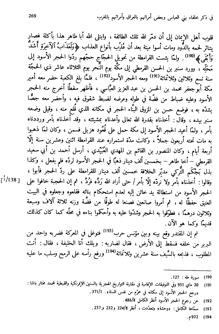 (¬192) عن رجوع الحجر الأسود أنظر الكامل 8/ 486.