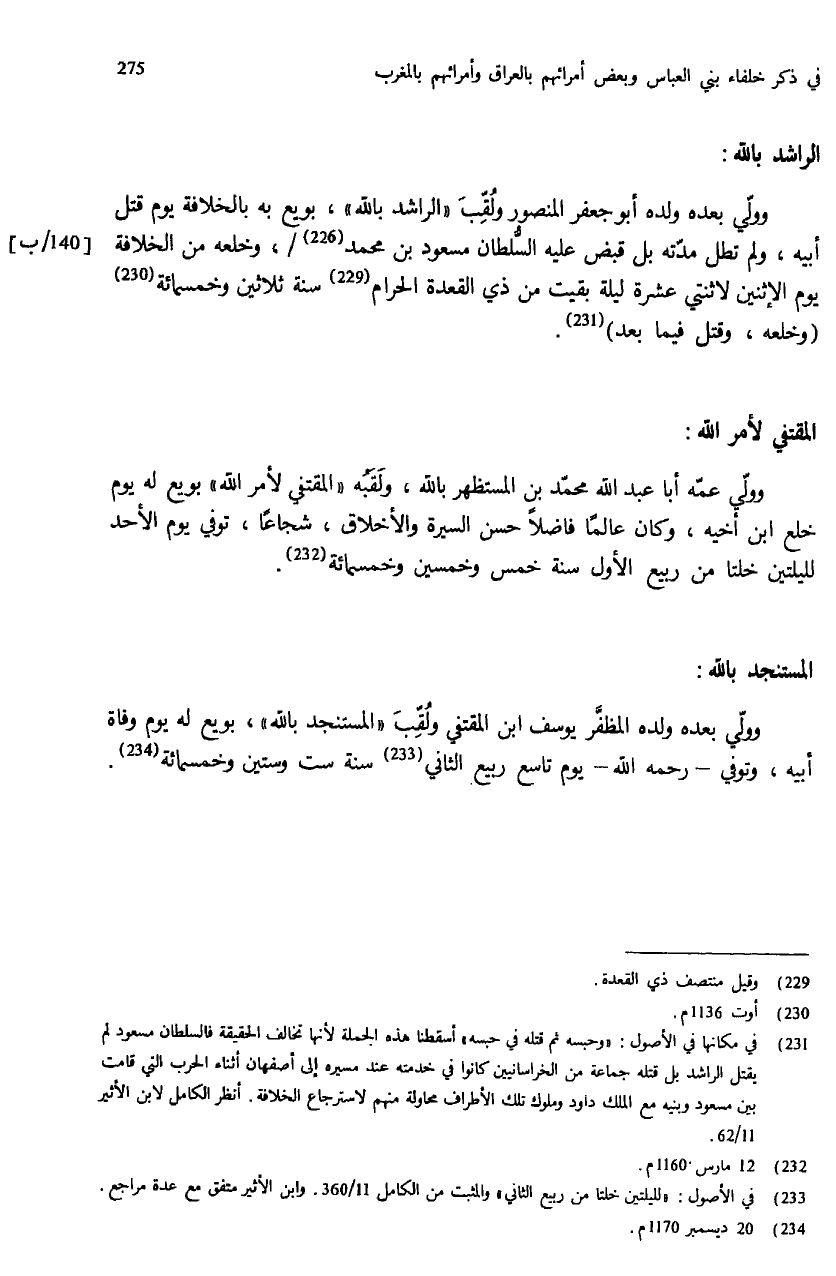 (¬231) في مكانها في الأصول: «وحبسه ثم قتله في حبسه» أسقطنا هذه الجملة لأنها تخالف الحقيقة فالسلطان مسعود لم يقتل الراشد بل قتله جماعة من الخراسانيين كانوا في خدمته عند مسيره إلى أصفهان أثناء الحرب التي قامت بين مسعود وبنيه مع الملك داود وملوك تلك الأطراف محاولة منهم لاسترجاع الخلافة. أنظر الكامل لابن الأثير 11/ 62.