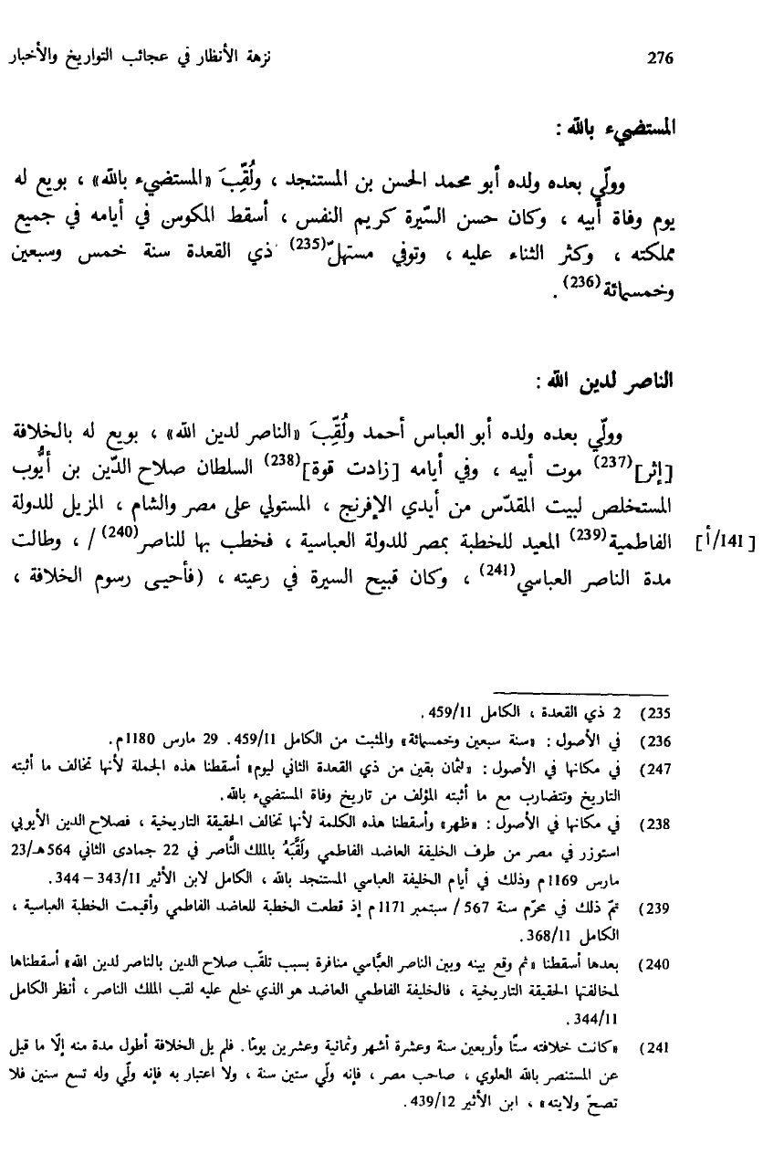 (¬238) في مكانها في الأصول: «ظهر» وأسقطنا هذه الكلمة لأنها تخالف الحقيقة التاريخية، فصلاح الدين الأيوبي استوزر في مصر من طرف الخليفة العاضد الفاطمي ولقّبه بالملك النّاصر في 22 جمادى الثاني 564 هـ - 23 مارس 1169 م وذلك في أيّام الخليفة العباسي المستنجد بالله، الكامل لابن الأثير 11/ 343 - 344.