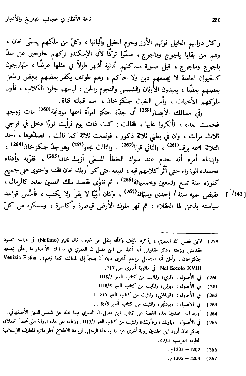 (¬259) لابن فضل الله العمري، يذكره المؤلف وكأنه ينقل عن غيره، قال نالينو (Nallino) في دراسة محمود مقديش ونزهته «ذكر مقديش أنه أخذ من ابن فضل الله العمري في مسالك الأبصار ما يتعلّق بجدود جنكز خان، وأظن أنه استعمل مراجع أخرى دون أن يلتجأ إلى المسالك كما زعم» Nel Secolo XVIII Venizia E sfax في مائوية أماري ص: 317.