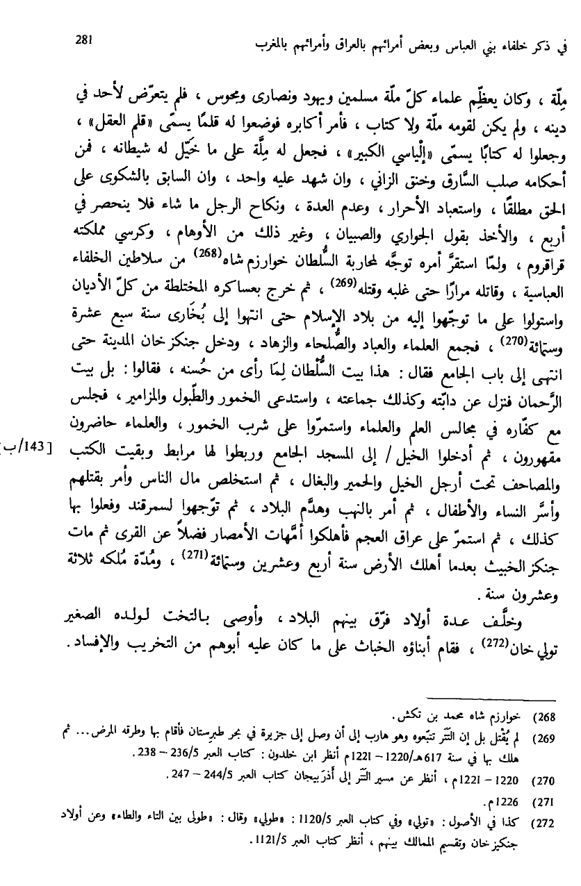(¬272) كذا في الأصول: «تولي» وفي كتاب العبر 5/ 1120: «طولي» وقال: «طولى بين التاء والطاء» وعن أولاد جنكيز خان وتقسيم الممالك بينهم، أنظر كتاب العبر 5/ 1121.