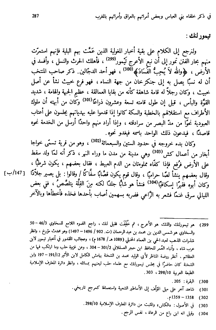 (¬299) هو تيمورلنك واللنك هو الأعرج، ثم خفّفت فقيل لنك، راجع الضوء اللامع للسخاوي 3/ 46 - 50 والسخاوي هو شمس الدين بن محمد بن عبد الرحمان (ت.902/ 1496 - 1497) وهو محدث مؤرخ، وانظر شذرات الذهب لعبد الحي بن العماد الحنبلي (1089 هـ - 1678 م)، وعجائب المقدور في أخبار تيمور لابن عرب شاه، وأنباء العمر للحافظ ابن حجر العسقلاني 2/ 301 - 304، وعن غزوة حلب وما ارتكب فيها من العظائم، أنظر روضة المناظر لأبي الوليد محمد بن الشخنة بهامش الكامل لابن الأثير 12/ 191 - 197 وابن الشخنة كان حاضرا في مجلس تيمورلنك مع علماء حلب ليعنيهم بمسائله، وانظر دائرة المعارف الإسلامية الطبعة العربية 10/ 298، 303.