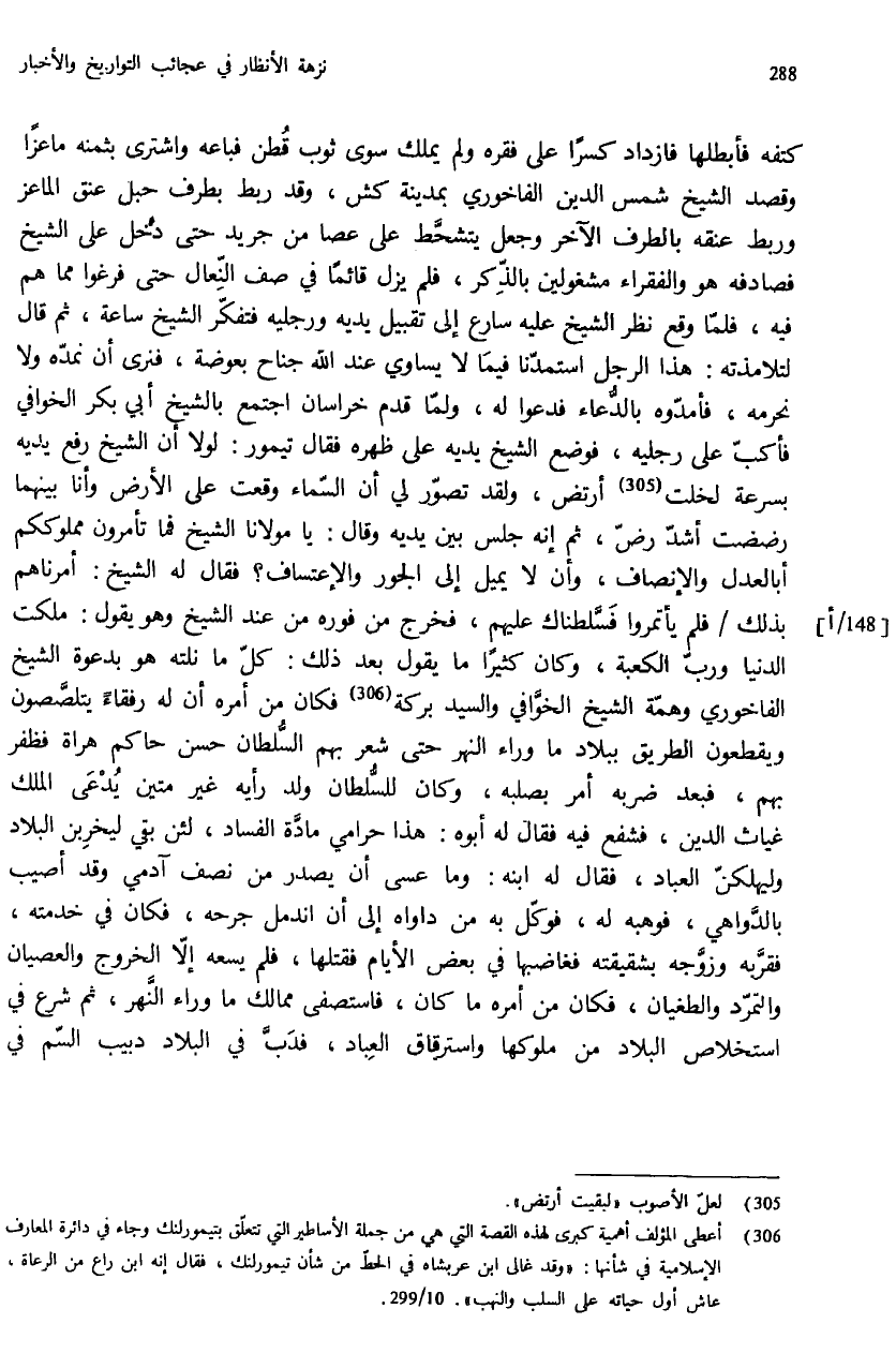 (¬306) أعطى المؤلف أهمية كبرى لهذه القصة التي هي من جملة الأساطير التي تتعلّق بتيمورلنك وجاء في دائرة المعارف الإسلامية في شأنها: «وقد غالى ابن عربشاه في الحطّ من شأن تيمور لنك، فقال إنه ابن راع من الرعاة، عاش أول حياته على السلب والنهب».10/ 299.