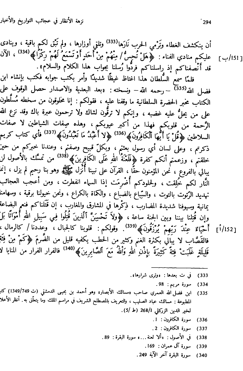 (¬335) ابن فضل الله العمري صاحب «مسالك الأبصار» وهو أحمد بن يحيى الدمشقي (ت 749/ 1349) كتبه المطبوعة: مسالك عباد الصليب، والتعريف بالمصطلح الشريف في مراسم الملك وما يتعلّق به. أنظر الأعلام لخير الدين الزركلي 1/ 268 (ط / 5).