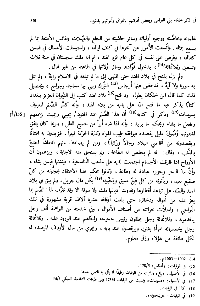 ولم يزل يفتح في بلاد الهند حتى انتهى إلى ما لم تبلغه في الاسلام راية، ولم تتل به سورة ولا آية، فدحض عنها أرجاس (¬15) الشّرك وبنى بها مساجد وجوامع، وتفصيل ذلك كما قال ابن خلكان يطول. ولما فتح (¬16) بلاد الهند كتب إلى الدّيوان العزيز ببغداد كتابا يذكر فيه ما فتح الله على يديه من بلاد الهند، وأنه كسّر الصّنم المعروف بسومنات (¬17) وذكر في كتابه (¬18) أن هذا الصّنم عند الهنود / يحيي ويميت بزعمهم ويفعل ما يشاء ويحكم ما يريد، وأنه اذا شاء أبرأ من جميع العلل، وربما كان يتفق لشقوتهم وصول عليل يقصده فيوافقه طيب الهواء وكثرة الحركة فيبرأ، فيزيدون به افتتانا ويقصدونه من أقاصي البلاد رجالا وركبانا، ومن لم يصادف منهم انتعاشا احتجّ بالذّنب، وقال: انه لم يخلص له الطّاعة، ولم يستحق منه الاجابة، ويزعمون أن الأرواح اذا فارقت الأجسام اجتمعت لديه على مذهب التّناسخية، فينشئها فيمن يشاء، وأنّ مدّ البحر وجزره عبادة له وطاعة، وكانوا بحكم هذا الاعتقاد يحجّونه من كلّ صقيع بعيد، ويأتونه من كل فجّ عميق ويحبونه (¬19) بكل مال جزيل، ولم يبق في بلاد الهند والسّند على تباعد أقطارها وتفاوت أديانها ملك ولا سوقة الا وقد تقرّب لهذا الصّنم بما يعزّ عليه من أمواله وذخائره حتى بلغت أوقافه عشرة آلاف قرية مشهورة في تلك النّواحي، وامتلأت خزائنه من أصناف الأموال، وفي خدمته من البراهمة ألف رجل يخدمونه، وثلاثمائة رجل يحلقون رؤوس حجيجه ولحاهم عند الورود عليه، وثلاثمائة رجل وخمسمائة امرأة يغنون ويرقصون عند بابه، ويجري من مال الأوقاف المرصدة له لكل طائفة من هؤلاء رزق معلوم.