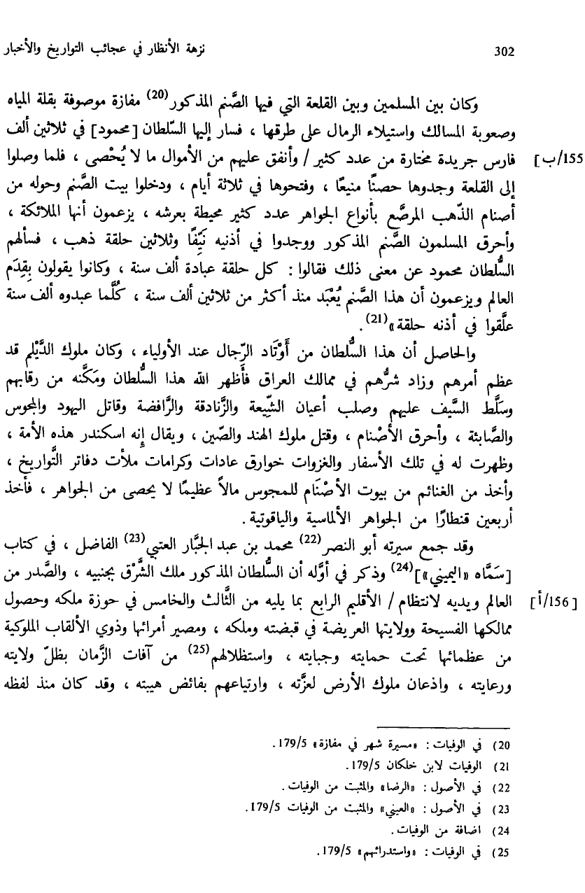 وكان بين المسلمين وبين القلعة التي فيها الصّنم المذكور (¬20) مفازة موصوفة بقلة المياه وصعوبة المسالك واستيلاء الرمال على طرقها، فسار إليها السّلطان [محمود] في ثلاثين ألف فارس جريدة مختارة من عدد كثير / وأنفق عليهم من الأموال ما لا يحصى، فلما وصلوا إلى القلعة وجدوها حصنا منيعا، وفتحوها في ثلاثة أيام، ودخلوا بيت الصّنم وحوله من أصنام الذّهب المرصّع بأنواع الجواهر عدد كثير محيطة بعرشه، يزعمون أنها الملائكة، وأحرق المسلمون الصّنم المذكور ووجدوا في أذنيه نيّفا وثلاثين حلقة ذهب، فسألهم السّلطان محمود عن معنى ذلك فقالوا: كل حلقة عبادة ألف سنة، وكانوا يقولون بقدم العالم ويزعمون أن هذا الصّنم يعبد منذ أكثر من ثلاثين ألف سنة، كلّما عبدوه ألف سنة علّقوا في أذنه حلقة» (¬21).