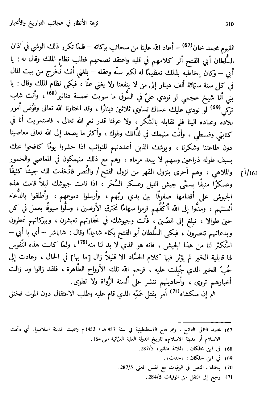 القيوم محمد خان (¬67) - أعاد الله علينا من سحائب بركاته - فلمّا تكرر ذلك الوشي في آذان السّلطان أبي الفتح أثر كلامهم في قلبه واعتقد نصحهم فطلب نظام الملك وقال له: يا أبي - وكان يخاطبه بذلك تعظيما له لكبر سنّه وعقله - بلغني أنك تخرج من بيت المال في كل سنة ستمائة ألف دينار إلى من لا ينفعنا ولا يغني عنّا، فبكى نظام الملك وقال: يا بني أنا شيخ عجمي لو نودي عليّ في السّوق ما سويت خمسة دنانير (¬68)، وأنت شاب تركي (¬69) لو نودي عليك عساك تساوي ثلاثين دينارا، وقد اختارنا الله تعالى وفوّض أمور بلاده وعباده الينا فلم نقابله بالشّكر، ولا عرفنا قدر نعم الله تعالى، فاستمريت أنا في كتابتي وضبطي، وأنت منهمك في لذّاتك ولهوك، وأكثر ما يصعد إلى الله تعالى معاصينا دون طاعتنا وشكرنا، ويوشك الذين أعددتهم للنوائب اذا حشروا يوما كافحوا عنك بسيف طوله ذراعين وسهم لا يبعد مرماه، وهم مع ذلك منهمكون في المعاصي والخمور والملاهي، وهم أحرى بنزول القهر من نزول الفتح / والنّصر فاتّخذت لك جيشا كثيفا وعسكرا منيفا يسمّى جيش الليل وعسكر السّحر، اذا نامت جيوشك ليلا قامت هذه الجيوش على أقدامها صفوفا بين يدي ربّهم، وأرسلوا دموعهم، وأطلقوا بالدّعاء ألسنتهم، ومدّوا إلى الله أكفّهم فرموا سهاما تخترق الأرضين، وسلّوا سيوفا يعمل في كل حين طوالا، تبلغ إلى الصّين، فأنت وجيوشك في خفارتهم تعيشون، وببركاتهم تمطرون وبدعائهم تنصرون، فبكى السّلطان أبو الفتح بكاء شديدا وقال: شاباشر - أي يا أبي - استكثر لنا من هذا الجيش، فانه هو الذي لا بد لنا منه (¬70)، ولمّا كانت هذه النّفوس لها قابلية الخير لم يؤثر فيها كلام الحسّاد الا قليلا زال [ما بها] في الحال، وعادت إلى حبّ الخير الذي جبلت عليه، فرحم الله تلك الأرواح الطّاهرة، فلقد زالوا وما زالت أخبارهم تروى، وأحاديثهم تنشر على ألسنة الرّواة ولا تطوى.