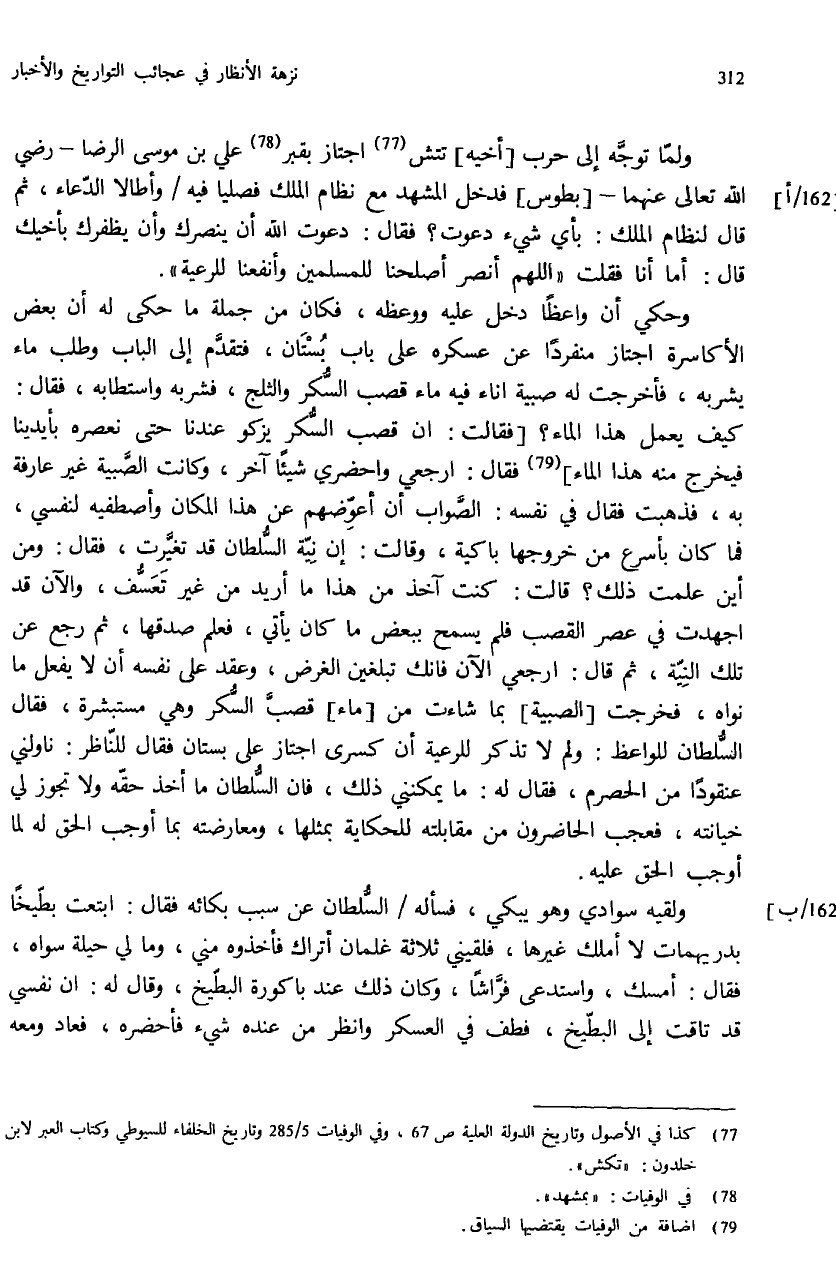ولقيه سوادي وهو يبكي، فسأله / السّلطان عن سبب بكائه فقال: ابتعت بطّيخا بدريهمات لا أملك غيرها، فلقيني ثلاثة غلمان أتراك فأخذوه مني، وما لي حيلة سواه، فقال: أمسك، واستدعى فرّاشا، وكان ذلك عند باكورة البطّيخ، وقال له: ان نفسي قد تاقت إلى البطّيخ، فطف في العسكر وانظر من عنده شيء فأحضره، فعاد ومعه
