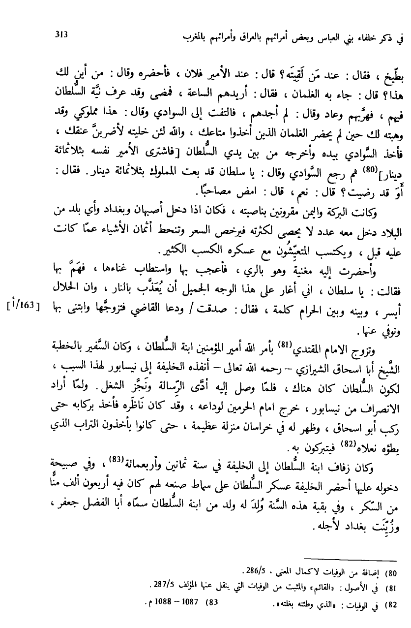 وتزوج الامام المقتدي (¬81) بأمر الله أمير المؤمنين ابنة السّلطان، وكان السّفير بالخطبة الشّيخ أبا اسحاق الشيرازي - رحمه الله تعالى - أنفذه الخليفة إلى نيسابور لهذا السبب، لكون السّلطان كان هناك، فلمّا وصل إليه أدّى الرّسالة ونجّز الشغل. ولمّا أراد الانصراف من نيسابور، خرج امام الحرمين لوداعه، وقد كان ناظره فأخذ بركابه حتى ركب أبو اسحاق، وظهر له في خراسان منزلة عظيمة، حتى كانوا يأخذون التراب الذي بطؤه نعلاه (¬82) فيتبركون به.