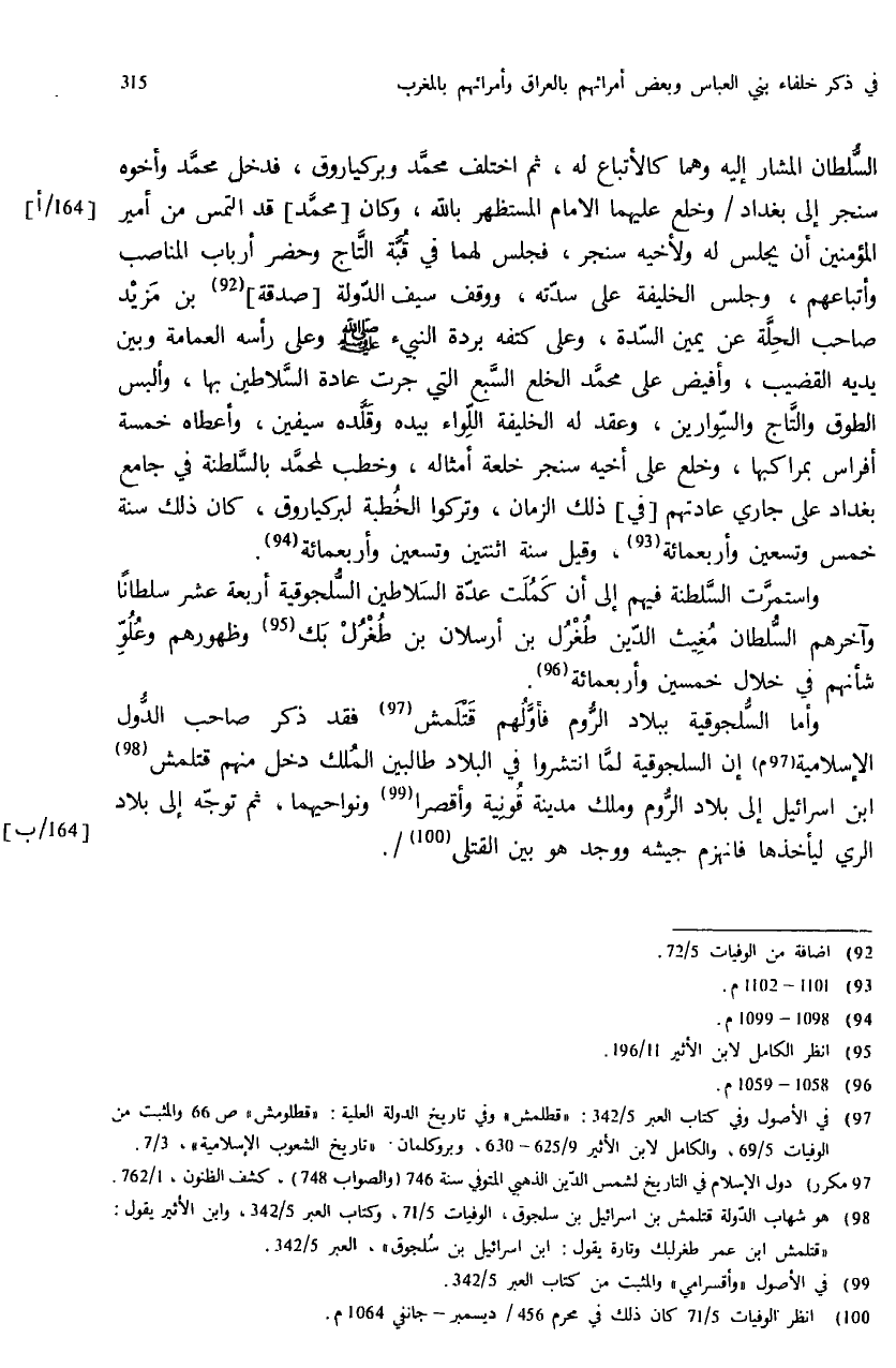 (¬98) هو شهاب الدّولة قتلمش بن إسرائيل بن سلجوق، الوفيات 5/ 71، وكتاب العبر 5/ 342، وابن الأثير يقول: «قتلمش ابن عمر طغرلبك وتارة يقول: ابن اسرائيل بن سلجوق»، العبر 5/ 342.