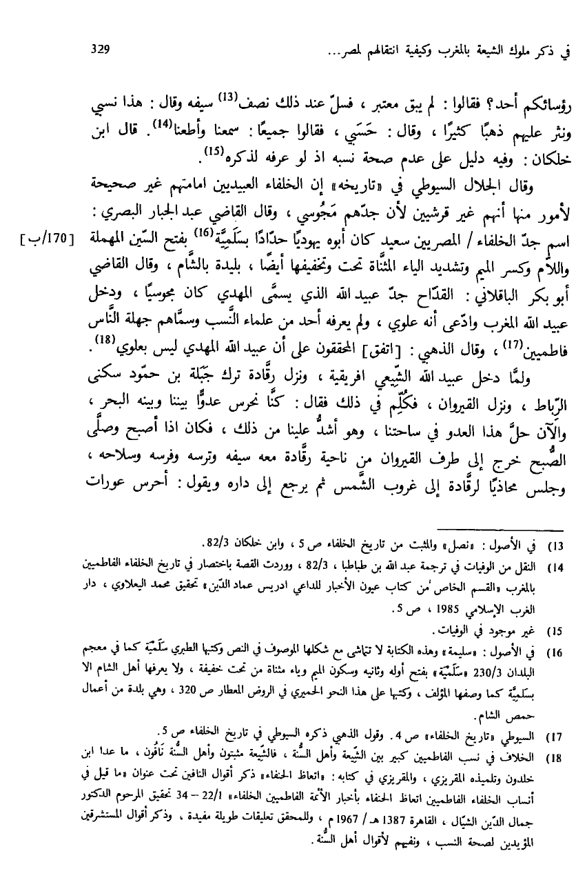 (¬18) الخلاف في نسب الفاطميين كبير بين الشّيعة وأهل السّنة، فالشّيعة مثبتون وأهل السّنة نافون، ما عدا ابن خلدون وتلميذه المقريزي، والمقريزي في كتابه: «اتعاظ الحنفاء» ذكر أقوال النافين تحت عنوان «ما قيل في أنساب الخلفاء الفاطميين اتعاظ الحنفاء بأخبار الأئمة الفاطميين الخلفاء» 1/ 22 - 34 تحقيق المرحوم الدكتور جمال الدّين الشيّال، القاهرة 1387 هـ - 1967 م، وللمحقق تعليقات طويلة مفيدة، وذكر أقوال المستشرقين المؤيدين لصحة النسب، ونفيهم لأقوال أهل السنّة.