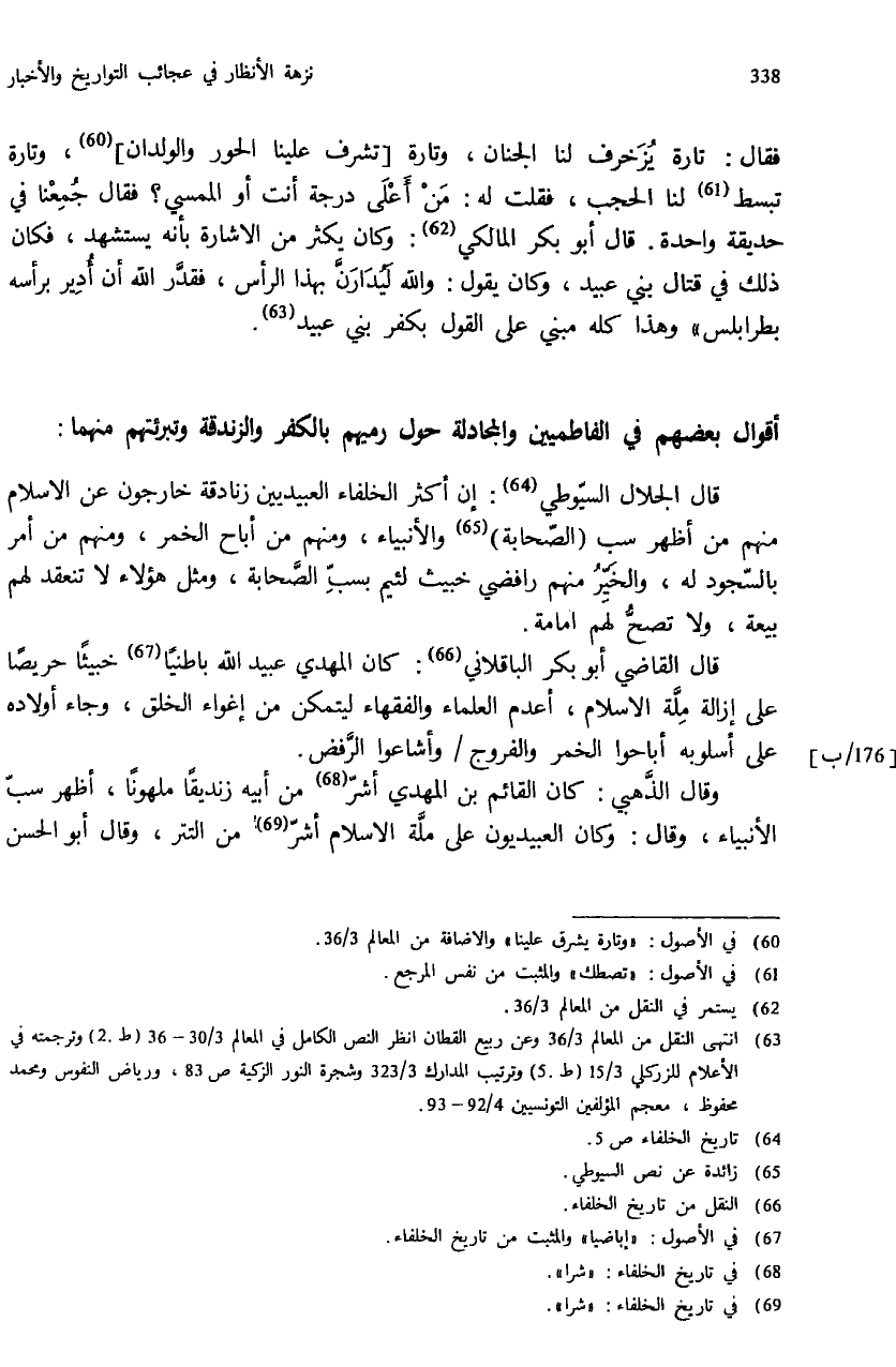 قال الجلال السّيوطي (¬64): إن أكثر الخلفاء العبيديين زنادقة خارجون عن الاسلام منهم من أظهر سب (الصّحابة) (¬65) والأنبياء، ومنهم من أباح الخمر، ومنهم من أمر بالسّجود له، والخيّر منهم رافضي خبيث لئيم بسبّ الصّحابة، ومثل هؤلاء لا تنعقد لهم بيعة، ولا تصحّ لهم امامة.