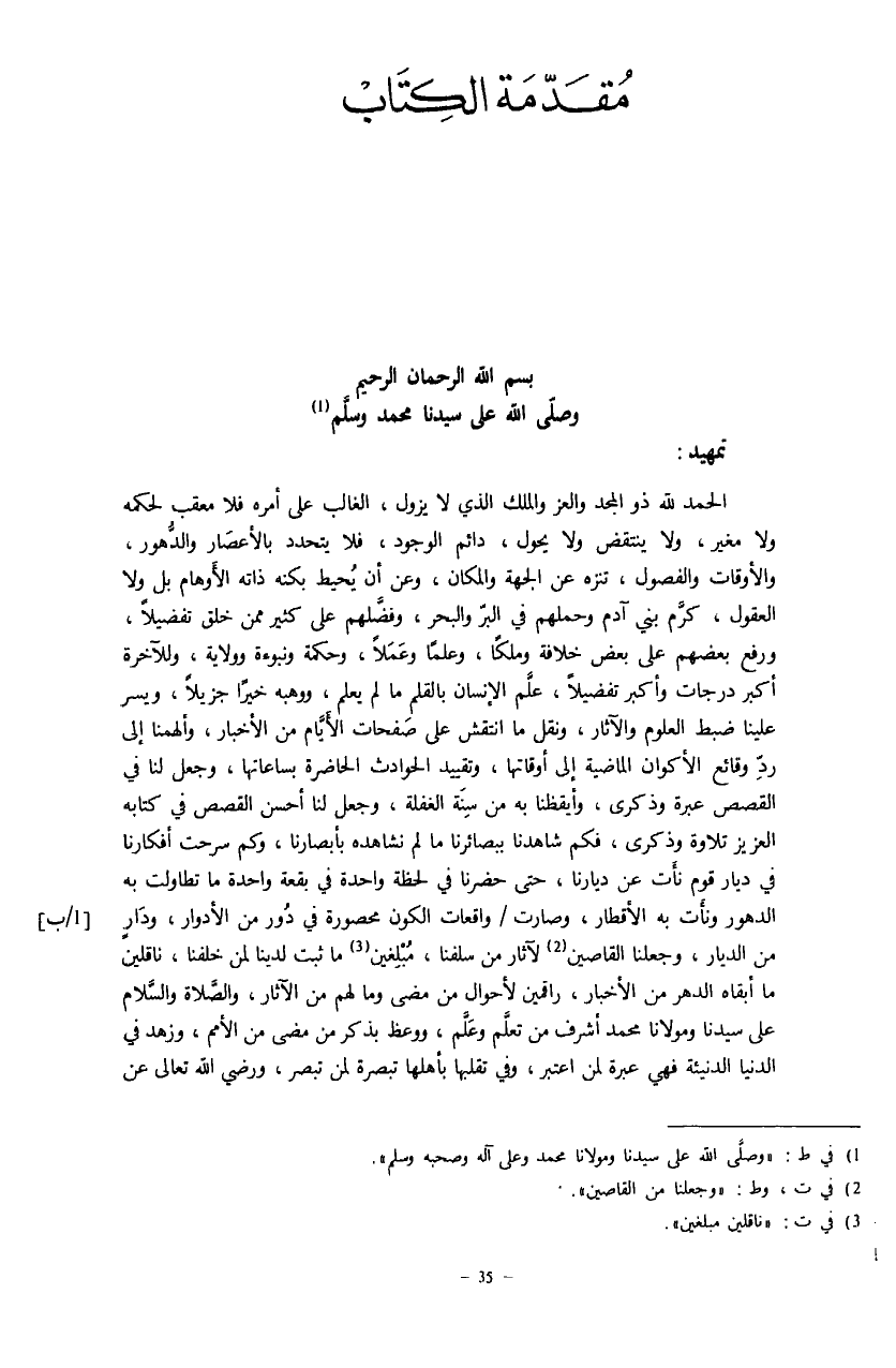 الحمد لله ذو المجد والعز والملك الذي لا يزول، الغالب على أمره فلا معقب لحكمه ولا مغير، ولا ينتقض ولا يحول، دائم الوجود، فلا يتحدد بالأعصار والدّهور، والأوقات والفصول، تنزه عن الجهة والمكان، وعن أن يحيط بكنه ذاته الأوهام بل ولا العقول، كرّم بني آدم وحملهم في البرّ والبحر، وفضّلهم على كثير ممن خلق تفضيلا، ورفع بعضهم على بعض خلافة وملكا، وعلما وعملا، وحكمة ونبوءة وولاية، وللآخرة أكبر درجات وأكبر تفضيلا، علّم الإنسان بالقلم ما لم يعلم، ووهبه خيرا جزيلا، ويسر علينا ضبط العلوم والآثار، ونقل ما انتقش على صفحات الأيّام من الأخبار، وألهمنا إلى ردّ وقائع الأكوان الماضية إلى أوقاتها، وتقييد الحوادث الحاضرة بساعاتها، وجعل لنا في القصص عبرة وذكرى، وأيقظنا به من سنة الغفلة، وجعل لنا أحسن القصص في كتابه العزيز تلاوة وذكرى، فكم شاهدنا ببصائرنا ما لم نشاهده بأبصارنا، وكم سرحت أفكارنا في ديار قوم نأت عن ديارنا، حتى حضرنا في لحظة واحدة في بقعة واحدة ما تطاولت به الدهور ونأت به الأقطار، وصارت واقعات الكون محصورة في دور من الأدوار، ودار من الديار، وجعلنا القاصين (¬2) لآثار من سلفنا، مبلغين (¬3) ما ثبت لدينا لمن خلفنا، ناقلين ما أبقاه الدهر من الأخبار، راقمين لأحوال من مضى وما لهم من الآثار، والصّلاة والسّلام على سيدنا ومولانا محمد أشرف من تعلّم وعلّم، ووعظ بذكر من مضى من الأمم، وزهد في الدنيا الدنيئة فهي عبرة لمن اعتبر، وفي تقلبها بأهلها تبصرة لمن تبصر، ورضي الله تعالى عن