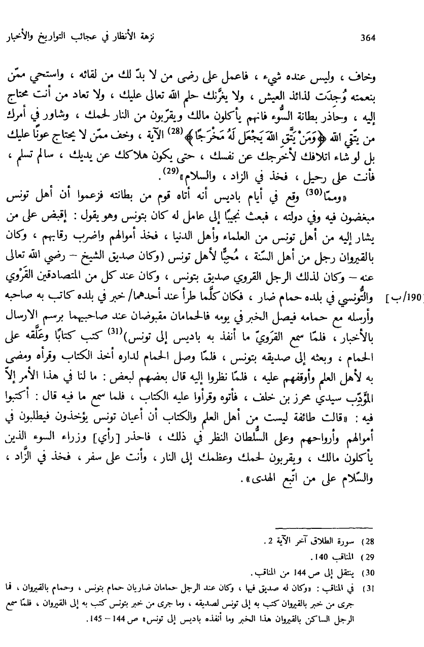 (¬31) في المناقب: «وكان له صديق فيها، وكان عند الرجل حمامان ضاريان حمام بتونس، وحمام بالقيروان، فما جرى من خبر بالقيروان كتب به إلى تونس لصديقه، وما جرى من خبر بتونس كتب به إلى القيروان، فلمّا سمع الرجل الساكن بالقيروان هذا الخبر وما أنفذه باديس إلى تونس» ص: 144 - 145.