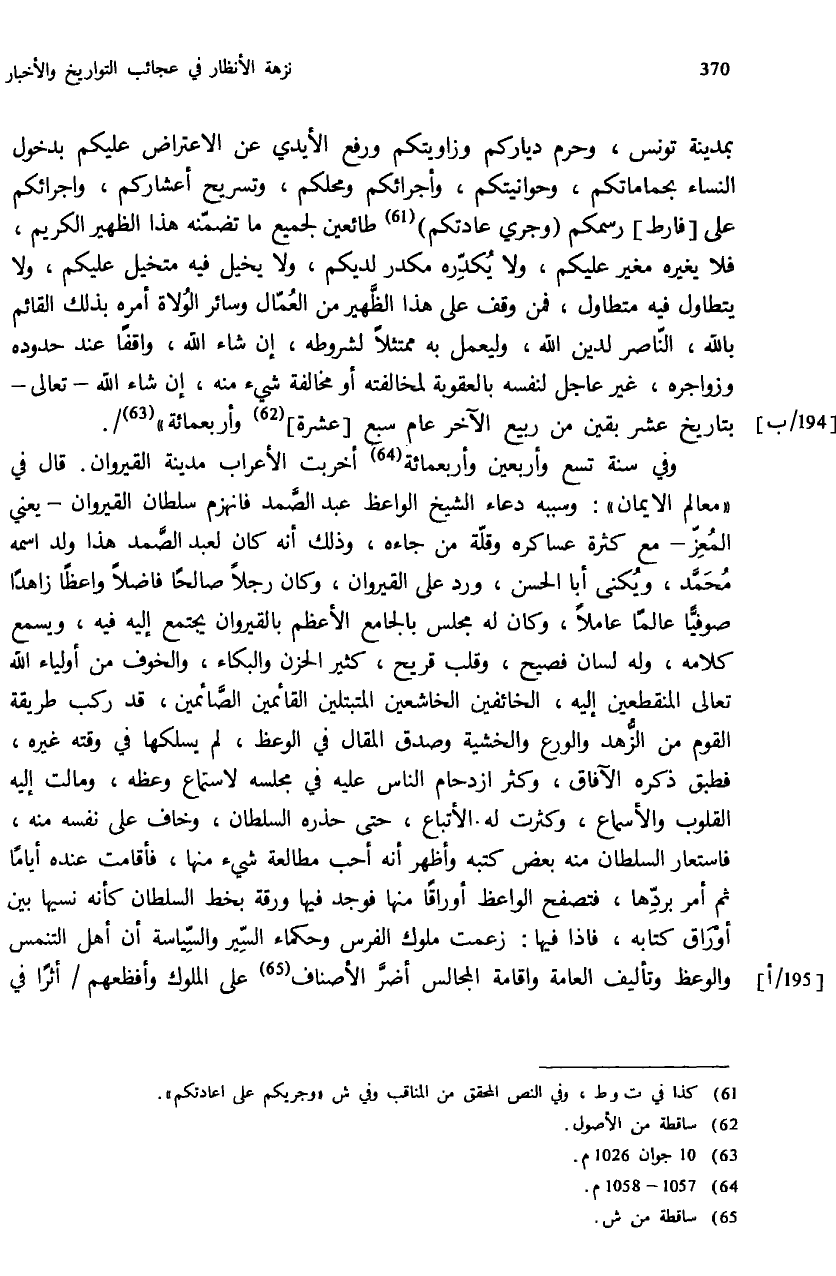 بمدينة تونس، وحرم دياركم وزاويتكم ورفع الأيدي عن الاعتراض عليكم بدخول النساء بحماماتكم، وحوانيتكم، وأجرائكم ومحلكم، وتسريح أعشاركم، واجرائكم على [فارط] رسمكم (وجري عادتكم) (¬61) طائعين لجميع ما تضمّنه هذا الظهير الكريم، فلا يغيره مغير عليكم، ولا يكدّره مكدر لديكم، ولا يخيل فيه متخيل عليكم، ولا يتطاول فيه متطاول، فمن وقف على هذا الظّهير من العمّال وسائر الولاة أمره بذلك القائم بالله، النّاصر لدين الله، وليعمل به ممتثلا لشروطه، إن شاء الله، واقفا عند حدوده وزواجره، غير عاجل لنفسه بالعقوبة لمخالفته أو مخالفة شيء منه، إن شاء الله - تعالى - بتاريخ عشر بقين من ربيع الآخر عام سبع [عشرة] (¬62) وأربعمائة» (¬63).