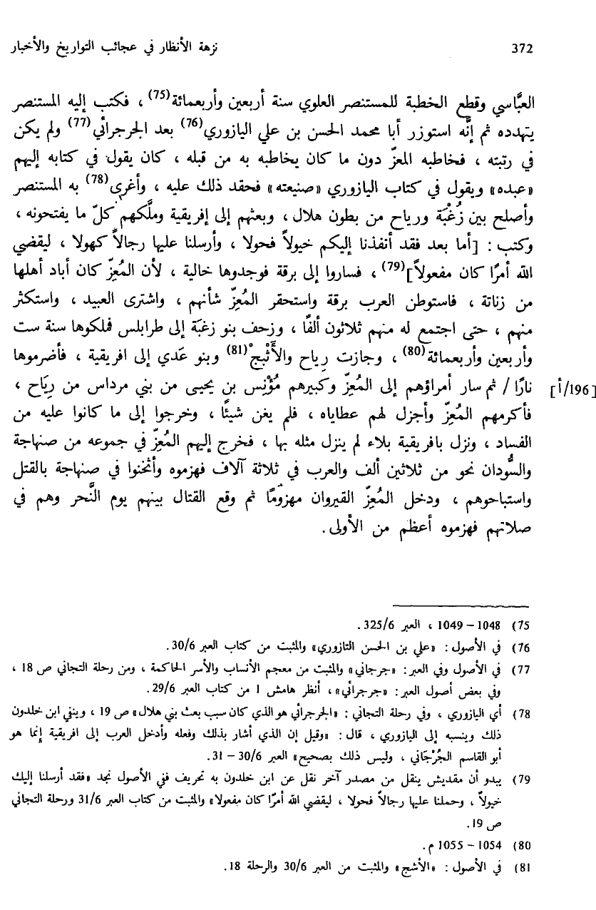 (¬78) أي اليازوري، وفي رحلة التجاني: «الجرجرائي هو الذي كان سبب بعث بني هلال» ص: 19، وينفي ابن خلدون ذلك وينسبه إلى اليازوري، قال: «وقيل إن الذي أشار بذلك وفعله وأدخل العرب إلى افريقية إنما هو أبو القاسم الجرجاني، وليس ذلك بصحيح» العبر 6/ 30 - 31.