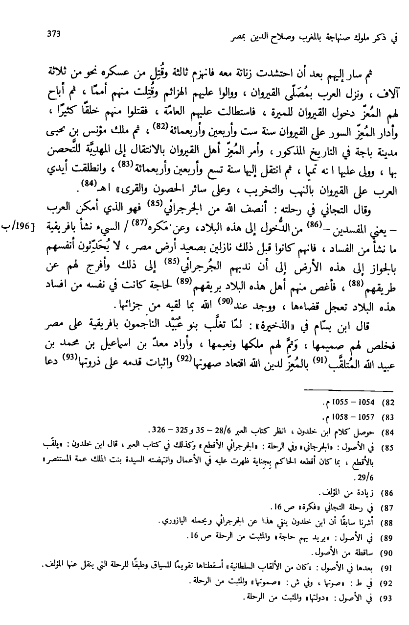 وقال التجاني في رحلته: أنصف الله من الجرجرائي (¬85) فهو الذي أمكن العرب - يعني المفسدين - (¬86) من الدّخول إلى هذه البلاد، وعن مكره (¬87) / السيء نشأ بافريقية ما نشأ من الفساد، فانهم كانوا قبل ذلك نازلين بصعيد أرض مصر، لا يحدّثون أنفسهم بالجواز إلى هذه الأرض إلى أن ندبهم الجرجرائي (85) إلى ذلك وأفرج لهم عن طريقهم (¬88)، فأغص منهم أهل هذه البلاد بريقهم (¬89) لحاجة كانت في نفسه من افساد هذه البلاد تعجل قضاءها، ووجد عند (¬90) الله بما لقيه من جزائها.