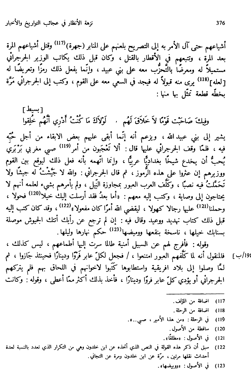 (¬122) سبق أن ذكر هذه القولة في النص الذي أخذه عن ابن خلدون وهي من التكرار الذي تعدد بالنسبة لعدة أحداث نقلها مرتين، مرّة عن ابن خلدون ومرة عن التجاني.