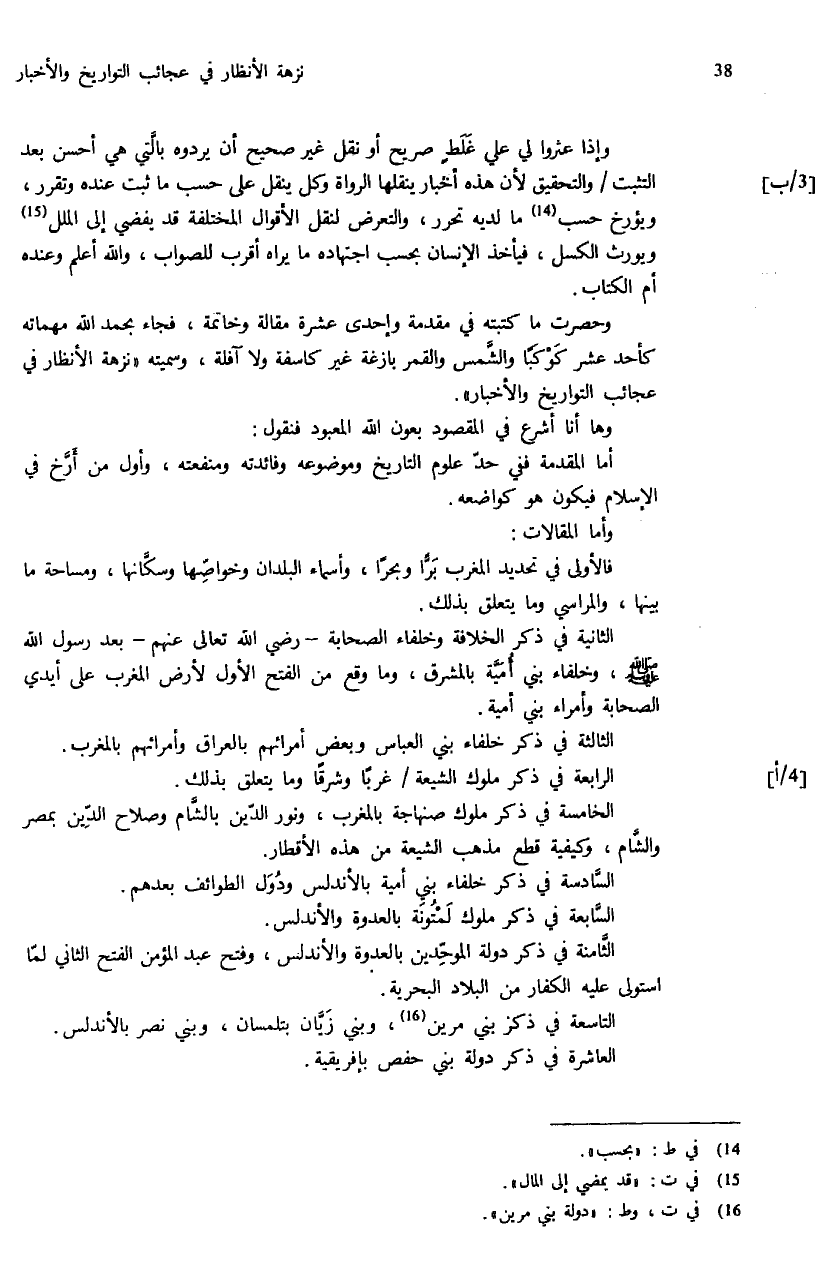 فالأولى في تحديد المغرب برّا وبحرا، وأسماء البلدان وخواصّها وسكّانها، ومساحة ما بينها، والمراسي وما يتعلق بذلك.
