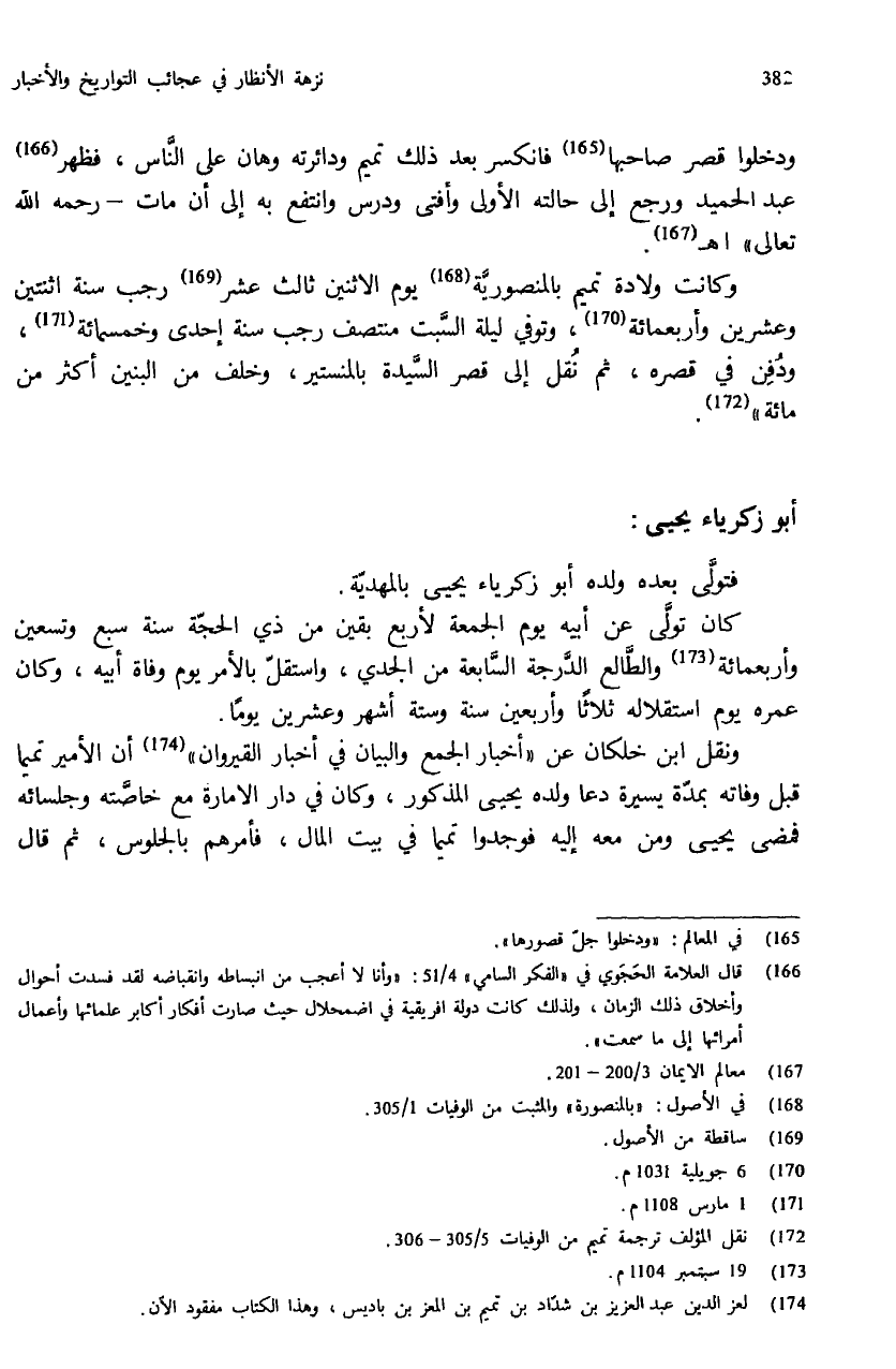 (¬166) قال العلامة الحجوي في «الفكر السامي» 4/ 51: «وأنا لا أعجب من انبساطه وانقباضه لقد فسدت أحوال وأخلاق ذلك الزمان، ولذلك كانت دولة افريقية في اضمحلال حيث صارت أفكار أكابر علمائها وأعمال أمرائها إلى ما سمعت».