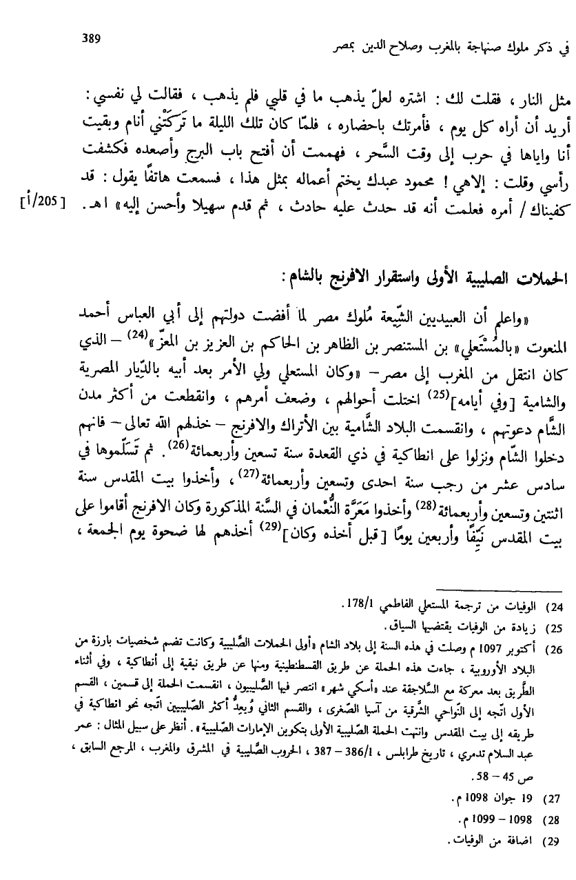 «واعلم أن العبيديين الشّيعة ملوك مصر لما أفضت دولتهم إلى أبي العباس أحمد المنعوت «بالمستعلي» بن المستنصر بن الظاهر بن الحاكم بن العزيز بن المعزّ» (¬24) - الذي كان انتقل من المغرب إلى مصر - «وكان المستعلي ولي الأمر بعد أبيه بالدّيار المصرية والشامية [وفي أيامه] (¬25) اختلت أحوالهم، وضعف أمرهم، وانقطعت من أكثر مدن الشّام دعوتهم، وانقسمت البلاد الشّامية بين الأتراك والافرنج - خذلهم الله تعالى - فانهم دخلوا الشّام ونزلوا على انطاكية في ذي القعدة سنة تسعين وأربعمائة (¬26). ثم تسلّموها في سادس عشر من رجب سنة احدى وتسعين وأربعمائة (¬27)، وأخذوا بيت المقدس سنة اثنتين وتسعين وأربعمائة (¬28) وأخذوا معرّة النّعمان في السّنة المذكورة وكان الافرنج أقاموا على بيت المقدس نيّفا وأربعين يوما [قبل أخذه وكان] (¬29) أخذهم لها ضحوة يوم الجمعة،
