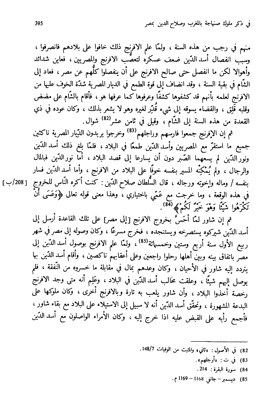 ثم إن الإفرنج جمعوا فارسهم وراجلهم (¬83) وخرجوا يريدون الدّيار المصرية ناكثين جميع ما استقرّ مع المصريين وأسد الدّين طمعا في البلاد، فلمّا بلغ ذلك أسد الدّين ونور الدّين لم يسعهما الصّبر دون أن يسارعا إلى قصد البلاد، أما نور الدّين فبالمال والرجال، ولم يمكنه المسير بنفسه خوفا على البلاد من الافرنج، وأما أسد الدّين فسار بنفسه / وماله وإخوته ورجاله، قال السّلطان صلاح الدّين: كنت أكره النّاس للخروج في هذه الوقعة، وما خرجت مع عمّي باختياري، وهذا معنى قوله تعالى {وَعَسى أَنْ تَكْرَهُوا شَيْئاً وَهُوَ خَيْرٌ لَكُمْ} (¬84).