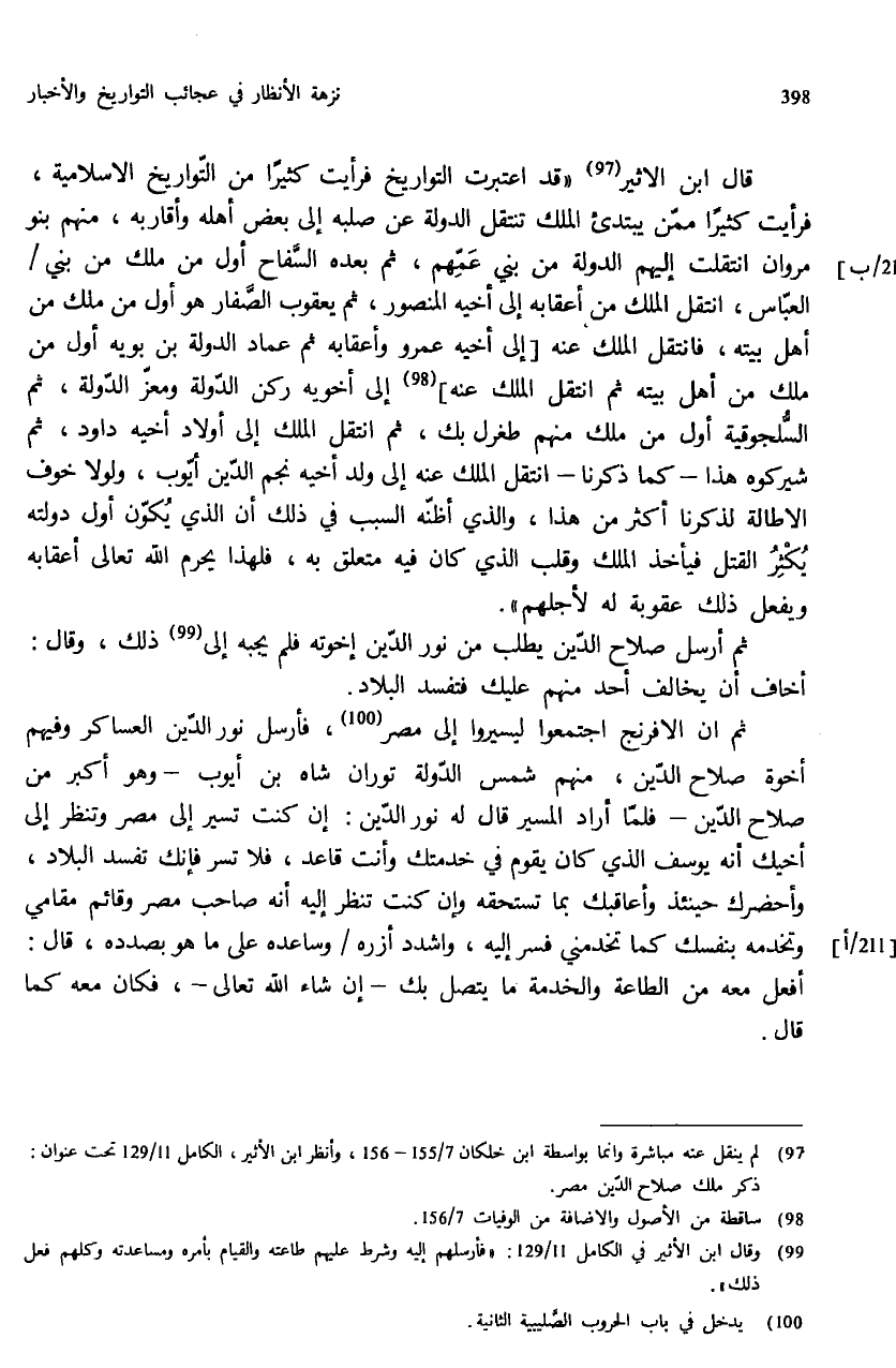 (¬97) لم ينقل عنه مباشرة وانما بواسطة ابن خلكان 7/ 155 - 156، وأنظر ابن الأثير، الكامل 11/ 129 تحت عنوان: ذكر ملك صلاح الدّين مصر.