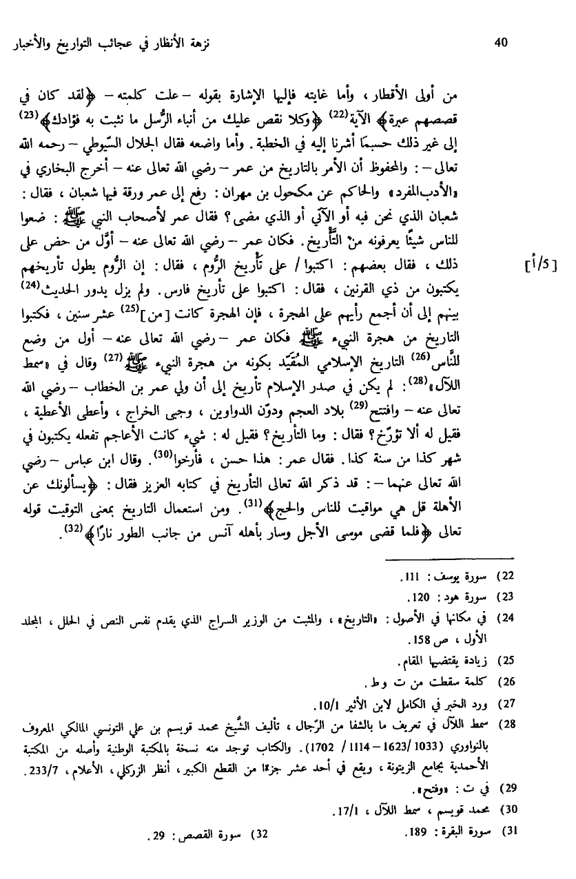شعبان الذي نحن فيه أو الآتي أو الذي مضى؟ فقال عمر لأصحاب النبي صلّى الله عليه وسلم: ضعوا للناس شيئا يعرفونه من التّاريخ. فكان عمر - رضي الله تعالى عنه - أوّل من حض على ذلك، فقال بعضهم: اكتبوا على تاريخ الرّوم، فقال: إن الرّوم يطول تأريخهم يكتبون من ذي القرنين، فقال: اكتبوا على تأريخ فارس. ولم يزل يدور الحديث (¬24) بينهم إلى أن أجمع رأيهم على الهجرة، فإن الهجرة كانت [من] (¬25) عشر سنين، فكتبوا التاريخ من هجرة النبيء صلّى الله عليه وسلم فكان عمر - رضي الله تعالى عنه - أول من وضع للنّاس (¬26) التاريخ الإسلامي المقيّد بكونه من هجرة النبيء صلّى الله عليه وسلم (¬27) وقال في «سمط اللآل» (¬28): لم يكن في صدر الإسلام تأريخ إلى أن ولي عمر بن الخطاب - رضي الله تعالى عنه - وافتتح (¬29) بلاد العجم ودوّن الدواوين، وجبى الخراج، وأعطى الأعطية، فقيل له ألا تؤرّخ؟ فقال: وما التأريخ؟ فقيل له: شيء كانت الأعاجم تفعله يكتبون في شهر كذا من سنة كذا. فقال عمر: هذا حسن، فأرخوا (¬30). وقال ابن عباس - رضي الله تعالى عنهما -: قد ذكر الله تعالى التأريخ في كتابه العزيز فقال: {يَسْئَلُونَكَ عَنِ الْأَهِلَّةِ قُلْ هِيَ مَواقِيتُ لِلنّاسِ وَالْحَجِّ} (¬31). ومن استعمال التاريخ بمعنى التوقيت قوله تعالى {فَلَمّا قَضى مُوسَى الْأَجَلَ وَسارَ بِأَهْلِهِ آنَسَ مِنْ جانِبِ الطُّورِ ناراً} (¬32).