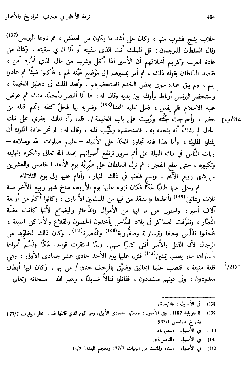 (¬139) 8 جويلية 1187، وفي الأصول: «مستهل جمادى الأولى» وهو اليوم الذي قاتلها فيه، انظر الوفيات 7/ 177 وتاريخ طرابلس 1/ 533.