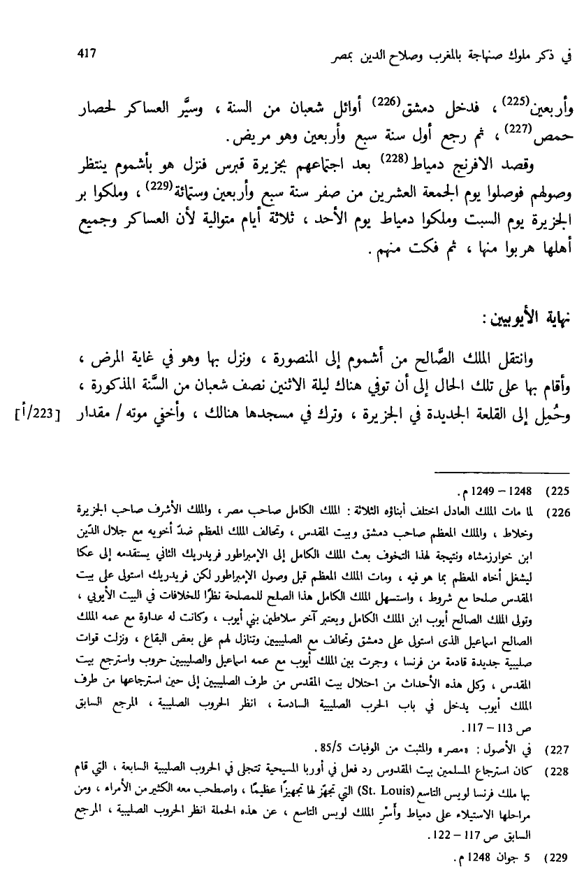 (¬228) كان استرجاع المسلمين بيت المقدوس رد فعل في أوربا المسيحية تتجلى في الحروب الصليبية السابعة، التي قام بها ملك فرنسا لويس التاسع (St. Louis) التي تجهّز لها تجهيزا عظيما، واصطحب معه الكثير من الأمراء، ومن مراحلها الاستيلاء على دمياط وأسر الملك لويس التاسع، عن هذه الحملة انظر الحروب الصليبية، المرجع السابق ص: 117 - 122.