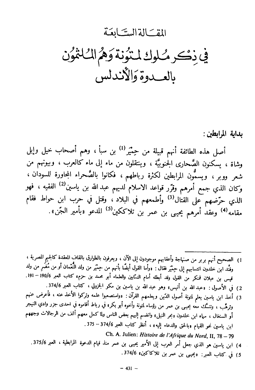(¬4) ابن ياسين هو الذي جعل أمر العرب إلى الأمير يحيى بن عمر منذ قيام الدعوة المرابطية، العبر 6/ 375.
