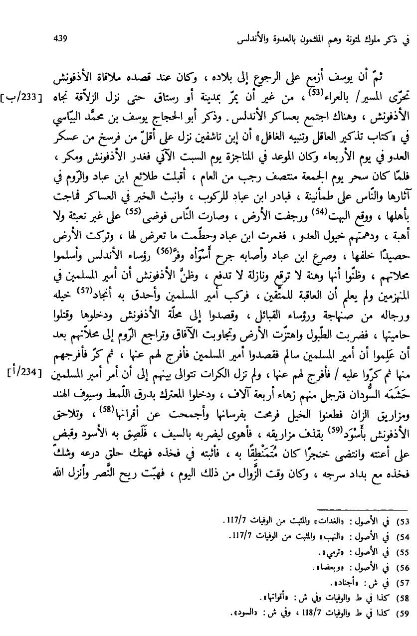 ثمّ أن يوسف أزمع على الرجوع إلى بلاده، وكان عند قصده ملاقاة الأذفونش تحرّى المسير / بالعراء (¬53)، من غير أن يمرّ بمدينة أو رستاق حتى نزل الزلاّقة تجاه الأذفونش، وهناك اجتمع بعساكر الأندلس. وذكر أبو الحجاج يوسف بن محمّد البيّاسي في «كتاب تذكير العاقل وتنبيه الغافل» أن إبن تاشفين نزل على أقلّ من فرسخ من عسكر العدو في يوم الأربعاء وكان الموعد في المناجزة يوم السبت الآتي فغدر الأذفونش ومكر، فلمّا كان سحر يوم الجمعة منتصف رجب من العام، أقبلت طلائع ابن عباد والرّوم في آثارها والنّاس على طمأنينة، فبادر ابن عباد للركوب، وانبث الخبر في العساكر فماجت بأهلها، ووقع البهت (¬54) ورجفت الأرض، وصارت النّاس فوضى (¬55) على غير تعبئة ولا أهبة، ودهمتهم خيول العدو، فغمرت ابن عباد وحطّمت ما تعرض لها، وتركت الأرض حصيدا خلفها، وصرع ابن عباد وأصابه جرح أسوأه وفرّ (¬56) رؤساء الأندلس وأسلموا محلاتهم، وظنّوا أنها وهنة لا ترقع ونازلة لا تدفع، وظنّ الأذفونش أن أمير المسلمين في المنهزمين ولم يعلم أن العاقبة للمتّقين، فركب أمير المسلمين وأحدق به أنجاد (¬57) خيله ورجاله من صنهاجة ورؤساء القبائل، وقصدوا إلى محلّة الأذفونش ودخلوها وقتلوا حاميتها، فضربت الطّبول واهتزّت الأرض وتجاوبت الآفاق وتراجع الرّوم إلى محلاّتهم بعد أن علموا أن أمير المسلمين سالم فقصدوا أمير المسلمين فأفرج لهم عنها، ثم كرّ فأفرجهم منها ثمّ كرّوا عليه / فأفرج لهم عنها، ولم تزل الكرات تتوالى بينهم إلى أن أمر أمير المسلمين حشمه السّودان فترجل منهم زهاء أربعة آلاف، ودخلوا المعترك بدرق اللّمط وسيوف الهند ومزاريق الزان فطعنوا الخيل فرمحت بفرسانها وأجمحت عن أقرانها (¬58)، وتلاحق الأذفونش بأسود (¬59) يقذف مزاريقه، فأهوى ليضربه بالسيف، فلصق به الأسود وقبض على أعنته وانتضى خنجرا كان متمنطقا به، فأثبته في فخذه فهتك حلق درعه وشكّ فخذه مع بداد سرجه، وكان وقت الزّوال من ذلك اليوم، فهبّت ريح النّصر وأنزل الله
