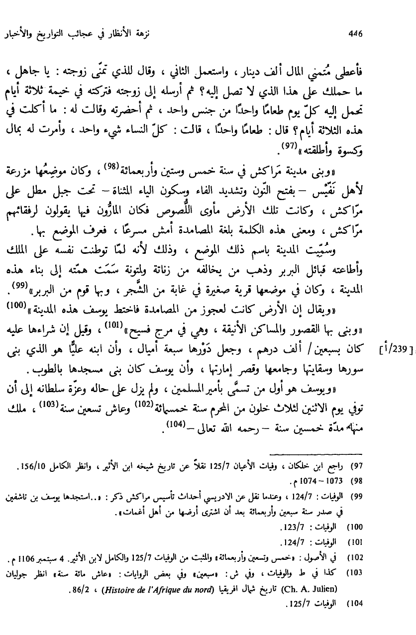(¬99) الوفيات: 7/ 124، وعندما نقل عن الادريسي أحداث تأسيس مراكش ذكر: «. . . استجدها يوسف بن تاشفين في صدر سنة سبعين وأربعمائة بعد أن اشترى أرضها من أهل أغمات».